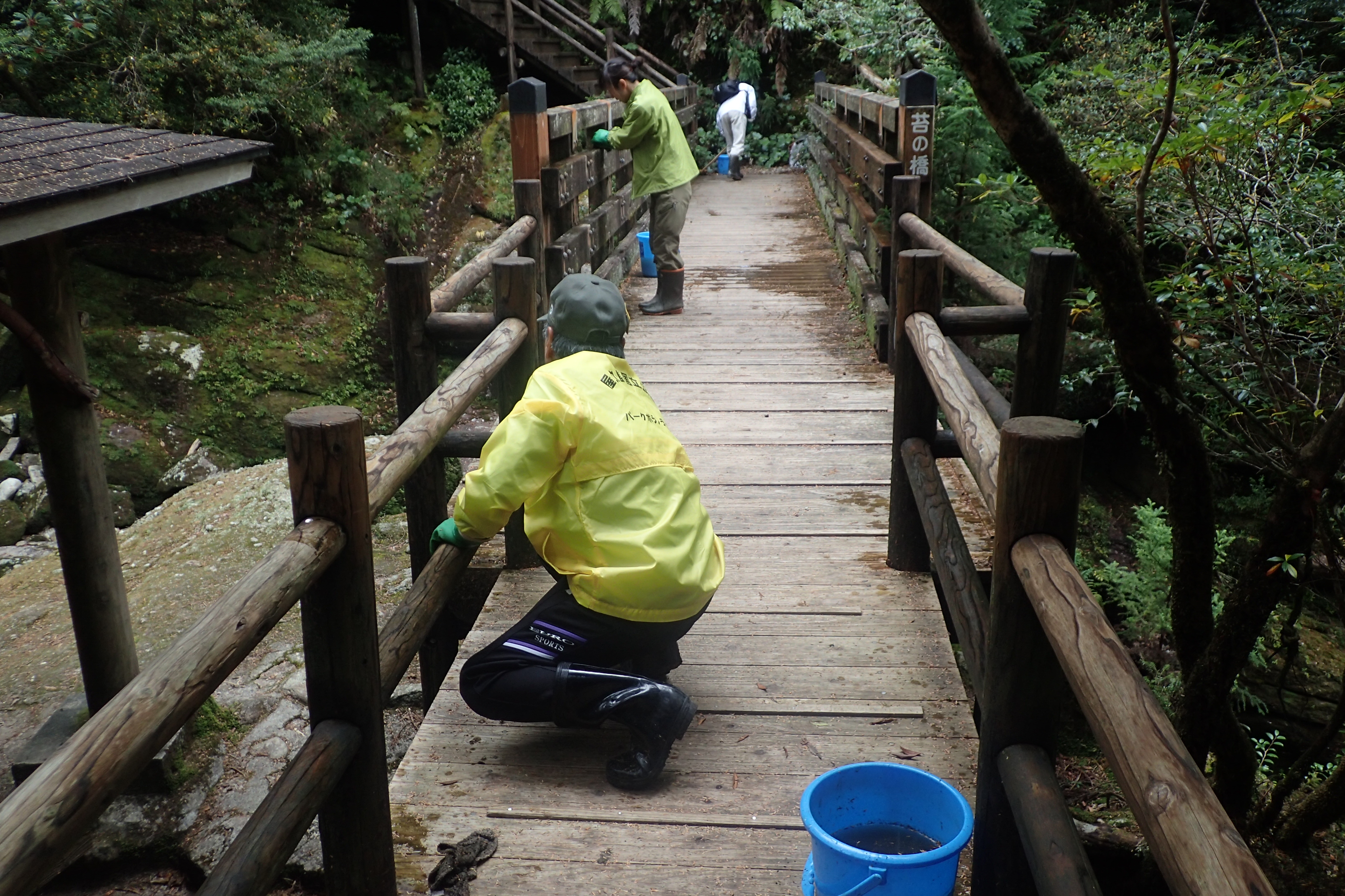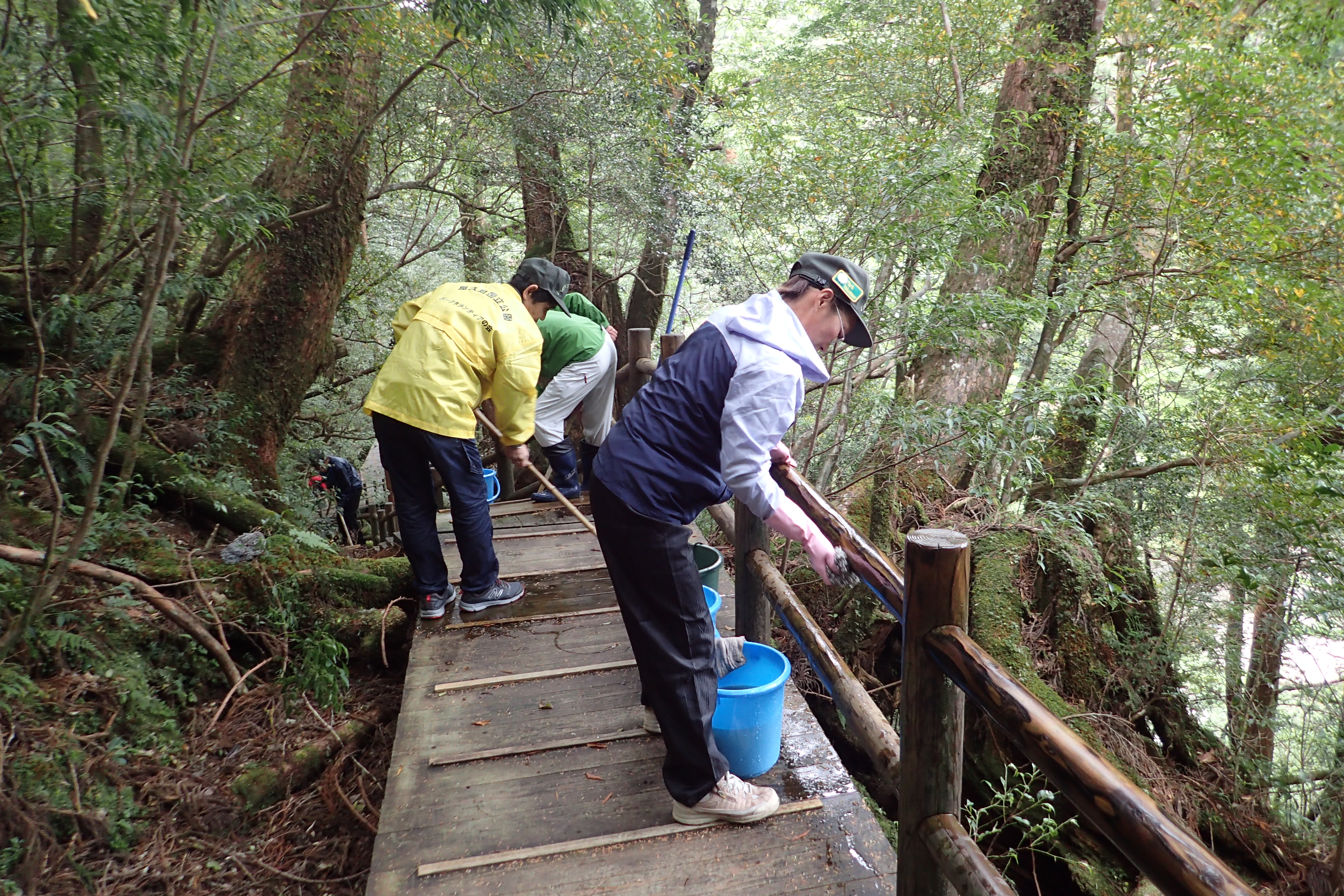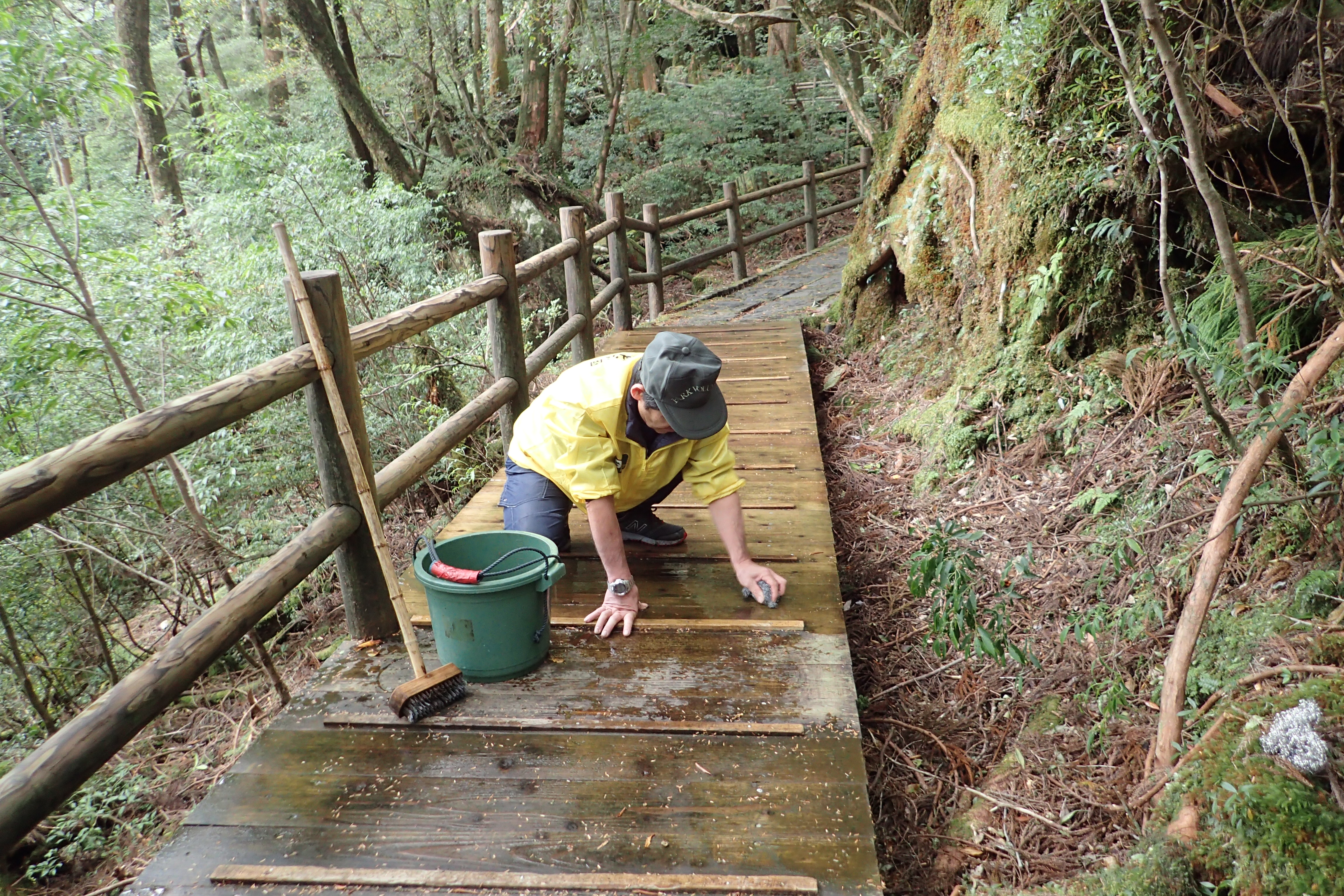 会員8名、職員2名の計10名で、2班に分かれて2時間半ほど木道や手すりのコケ落としを行いました。