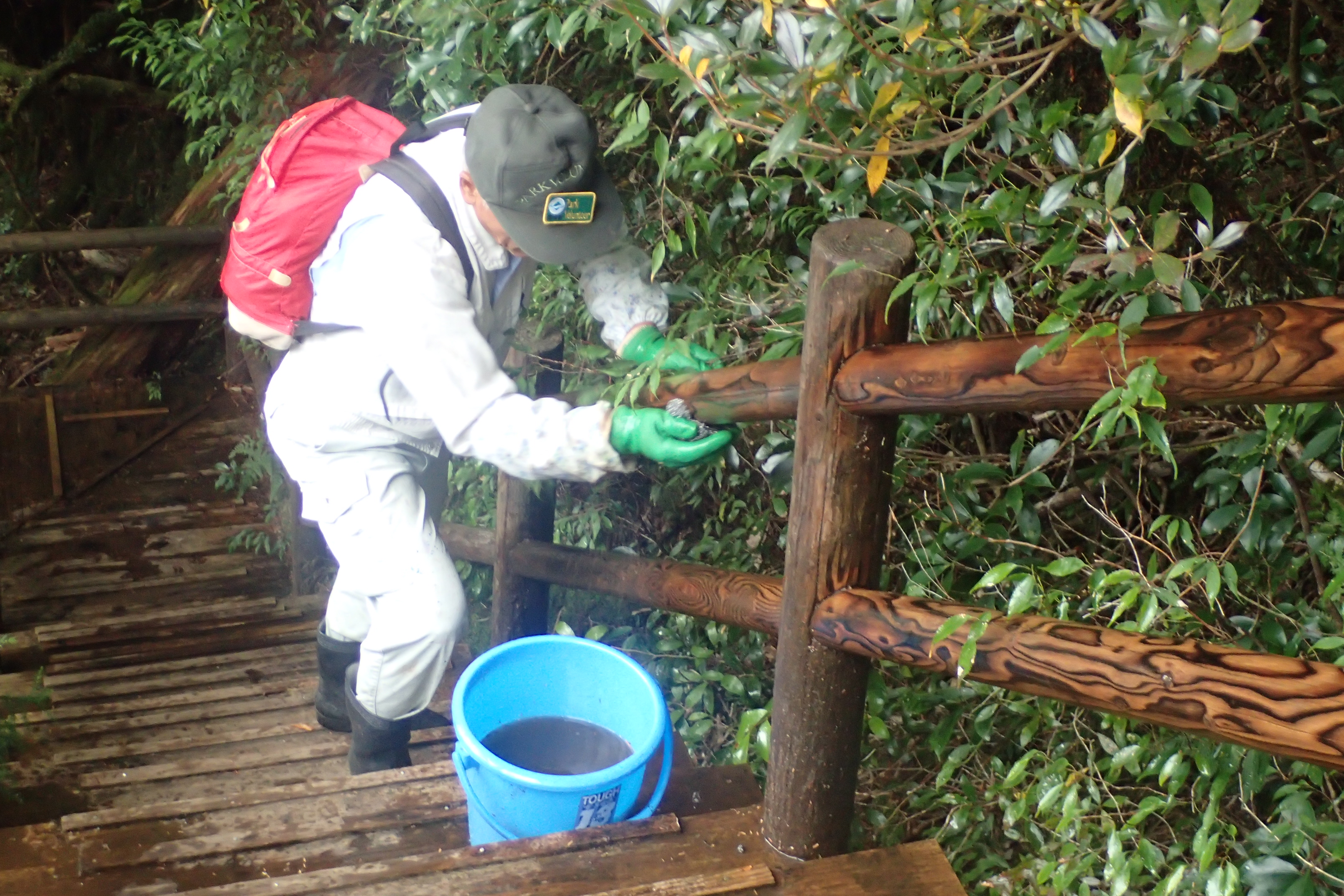 コケは濡れていた方が落ちやすいので、沢で何度も水を汲み、木道を濡らしては擦りを繰り返して綺麗にしました。