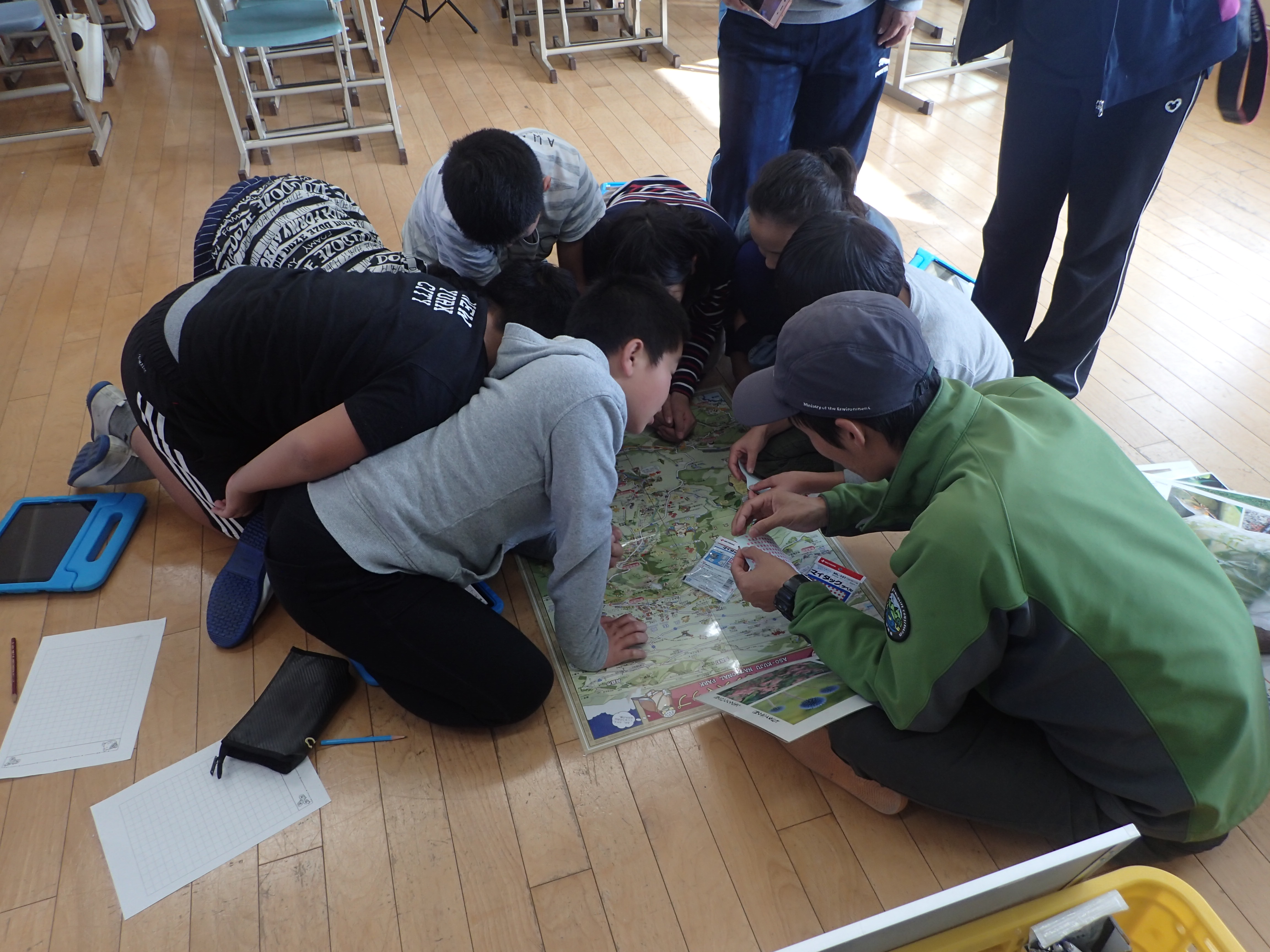 そんな子ども達にどんな話をしようかと考えていたのですが、当日は「外来種ってなに?」から始まり、写真や地図を使って、10年後、20年後、飯田高原で自分の子供達に残したい物や場所について話し合いました。子ども達からはヒゴタイやタデ原の花を残したいなどの意見が出ました。