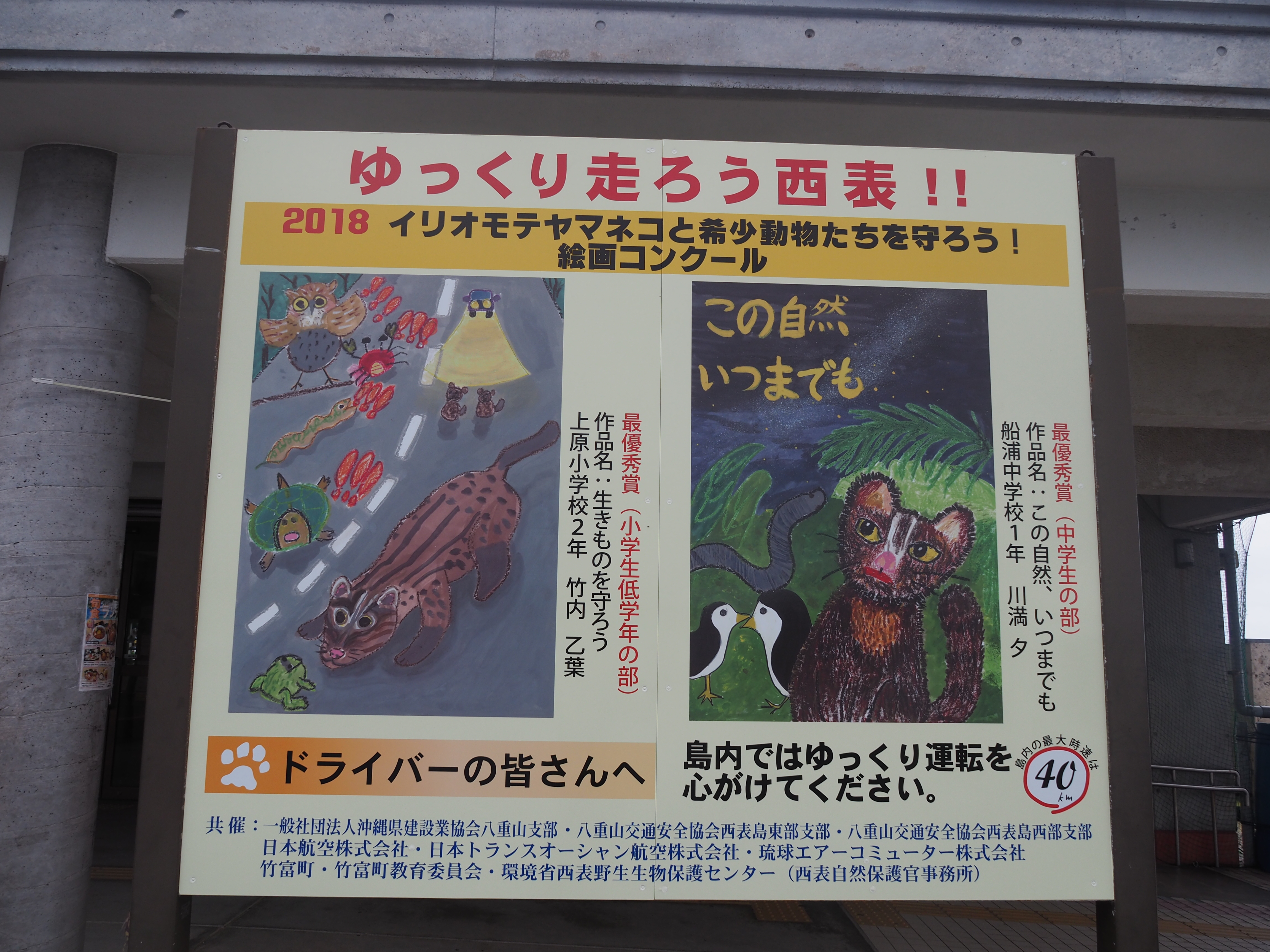昨年度までは応募作品の絵画展を西表島東部の大原港と西表野生生物保護センターのみで行っていましたが、今年度からは西表島西部の方や他の竹富町の離島を利用する方に見てもらいやすい様に、上原港と石垣港離島ターミナルでも絵画展を開催しております。