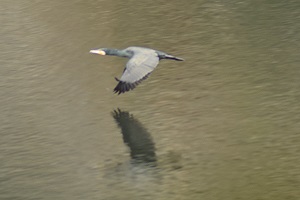 左:水面近くを飛ぶカワウ / 右:夕方に集まり始めたカワウの群
