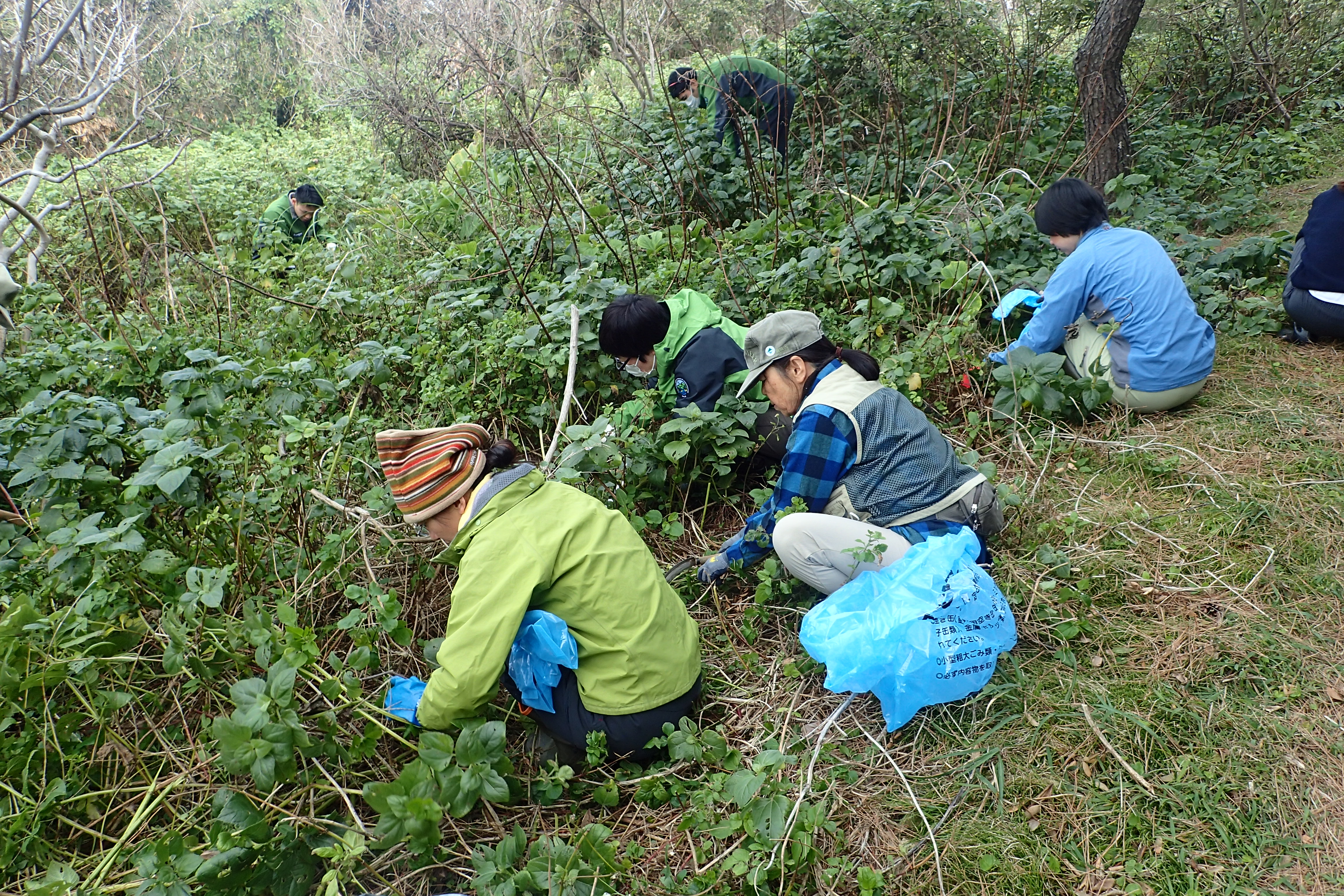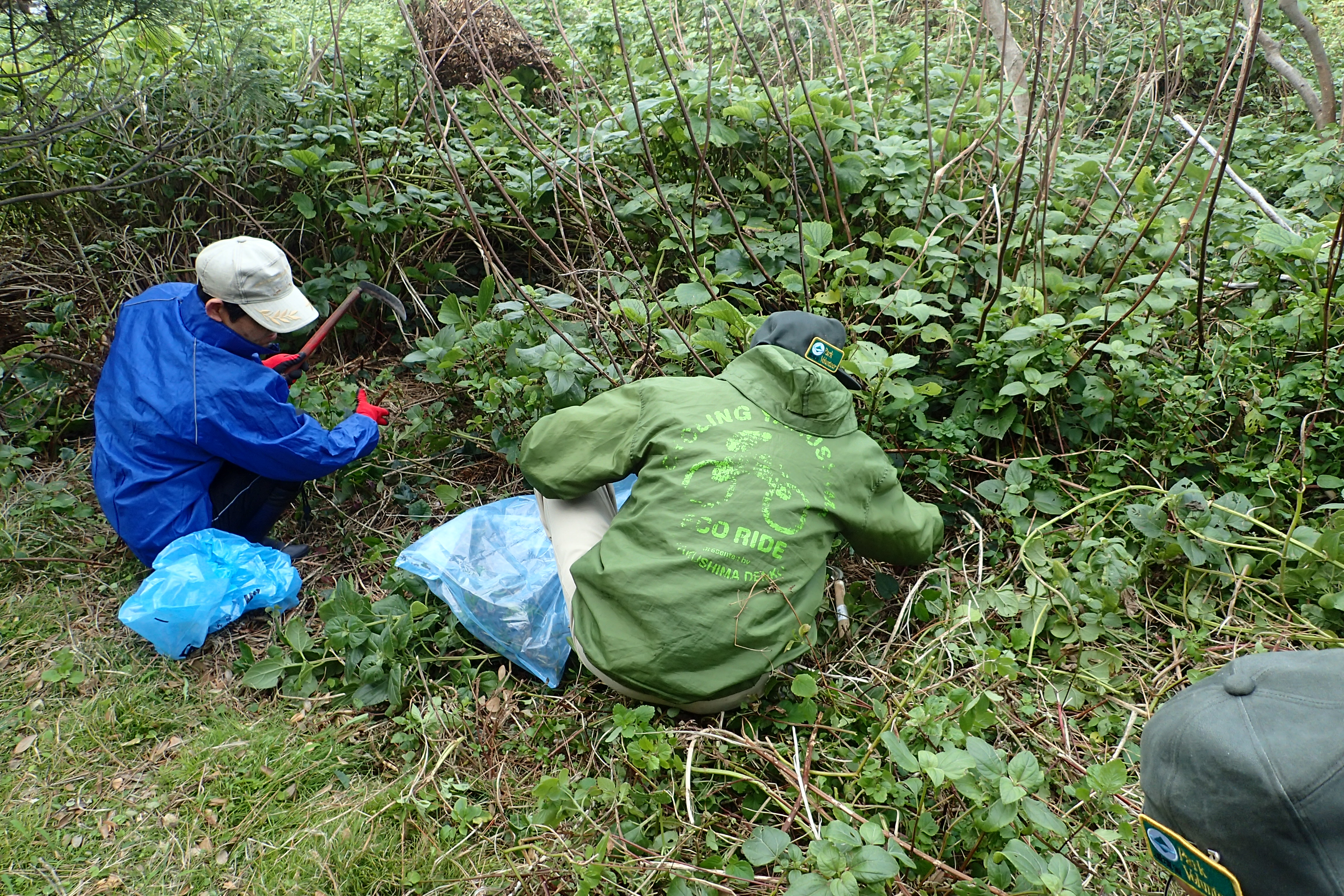 前回駆除した場所にはすでに在来植物が繁茂しており、再生しているアメリカハマグルマを探し出すのに苦労しました。