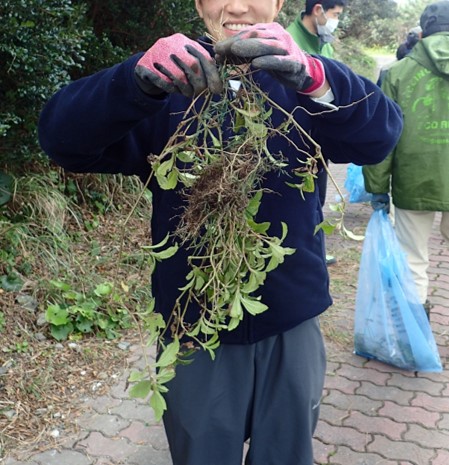 大変ですが、できるだけ在来植物を残しながらアメリカハマグルマを根っこから抜き取るという作業を行いました。