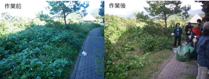 駆除を始めた頃は一面に繁茂しており軽トラックの荷台いっぱいにとれたアメリカハマグルマですが、数年にわたって駆除を続けたことで減少し、今回の活動ではゴミ袋1袋にも満たない量しかとれませんでした。