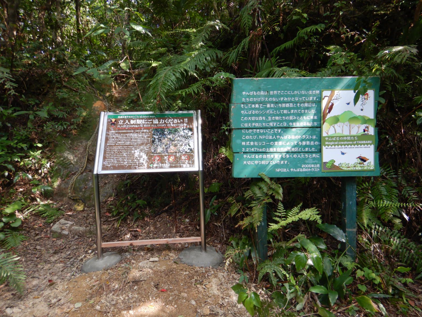▲与那覇岳の登山道中の看板。ここから上は踏査圧によって道が削られている場所があり、立ち入り制限の協力をお願いしています。