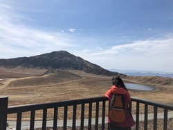 草千里ヶ浜展望所では、熊本県が昨年12月に展望デッキを整備し、阿蘇の外輪山の山々や阿蘇中岳火口を一望できるようになりました。