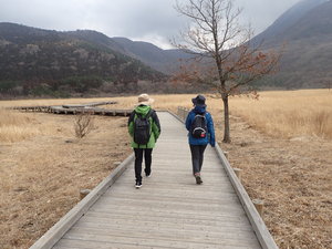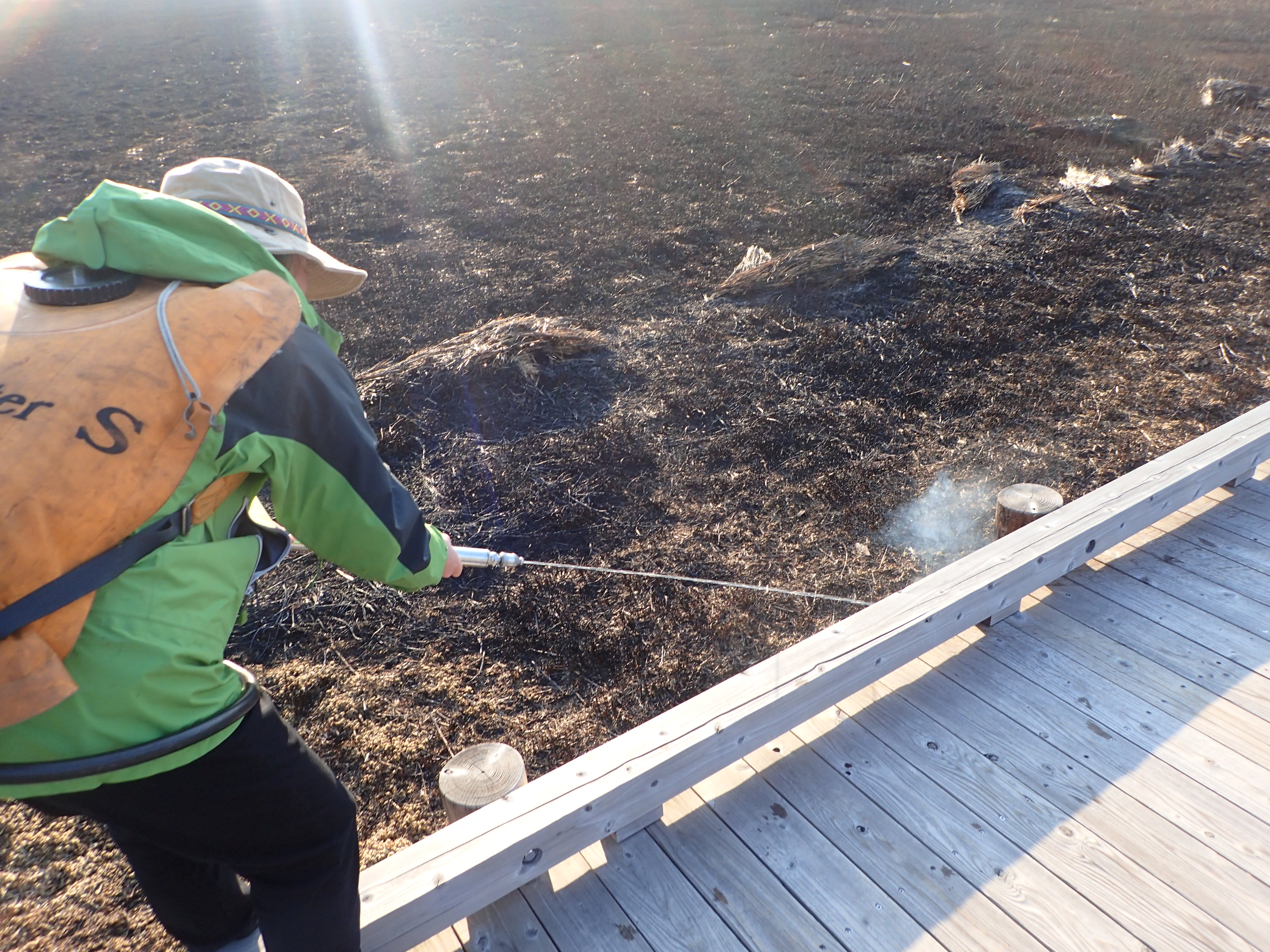 最後は野焼き終了後、ジェットシューターを背負って木道の点検です。