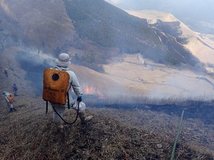 タデ原湿原の野焼きは飯田高原野焼き実行委員会が主催しており、この実行委員会には環境省も含め様々な関係団体が入っています。くじゅう管理官事務所では、この実行委員会のメンバーとして野焼きの支援を行っています。