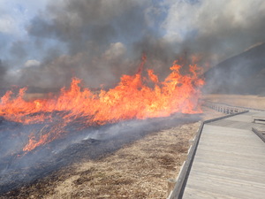 当日は阿蘇くじゅう国立公園管理事務所から2名の応援が来て、火入れの前に木道に人が入っていないか確認を行い、野焼き中には登山者へ迂回路の案内を実施しました。