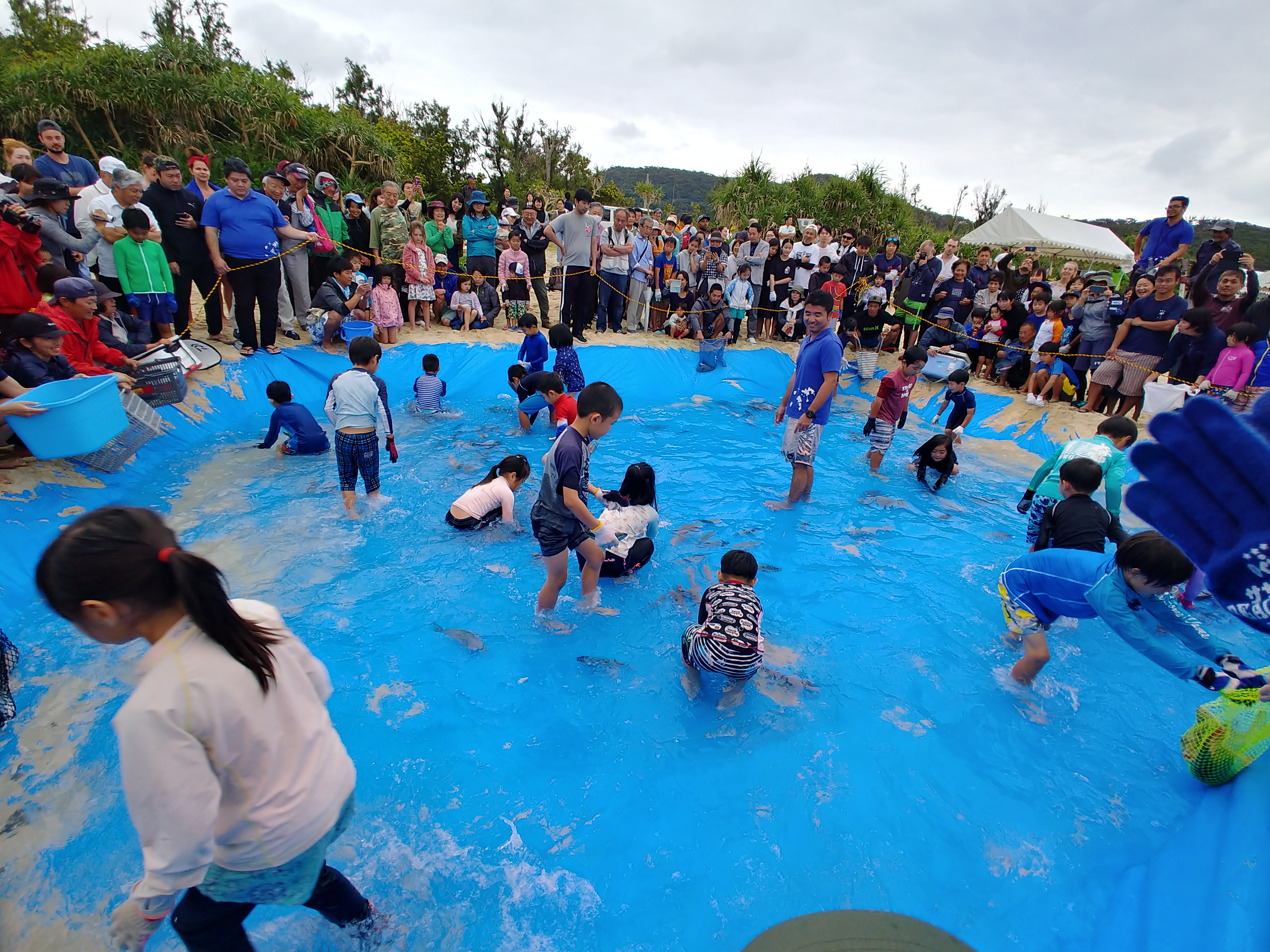 魚のつかみ取りです。島の有志の方が追い込み漁で捕まえてきた魚を子供達がつかみ取りします!