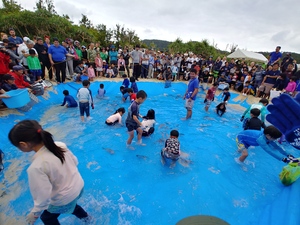 テープカットならぬ昆布でつくったテープで行われる昆布カット・魚のつかみ取りは雨の合間を見て