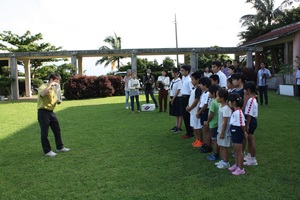放鳥会では、小中学校の校庭で発見時から放鳥までの経緯について写真をお見せしながら小中学校のみなさんに説明しました。また、冬から春先ごろまでカンムリワシは求愛活動や子育て時期に入るため、道路上にエサを求めて現れる機会も増え、交通事故に遭うケースが増える傾向にあるため、注意してほしいことなどを説明しました。その後、カンムリワシ・リサーチの方から発見し保護につなげた小中学校の児童生徒に感謝状が贈呈されました。