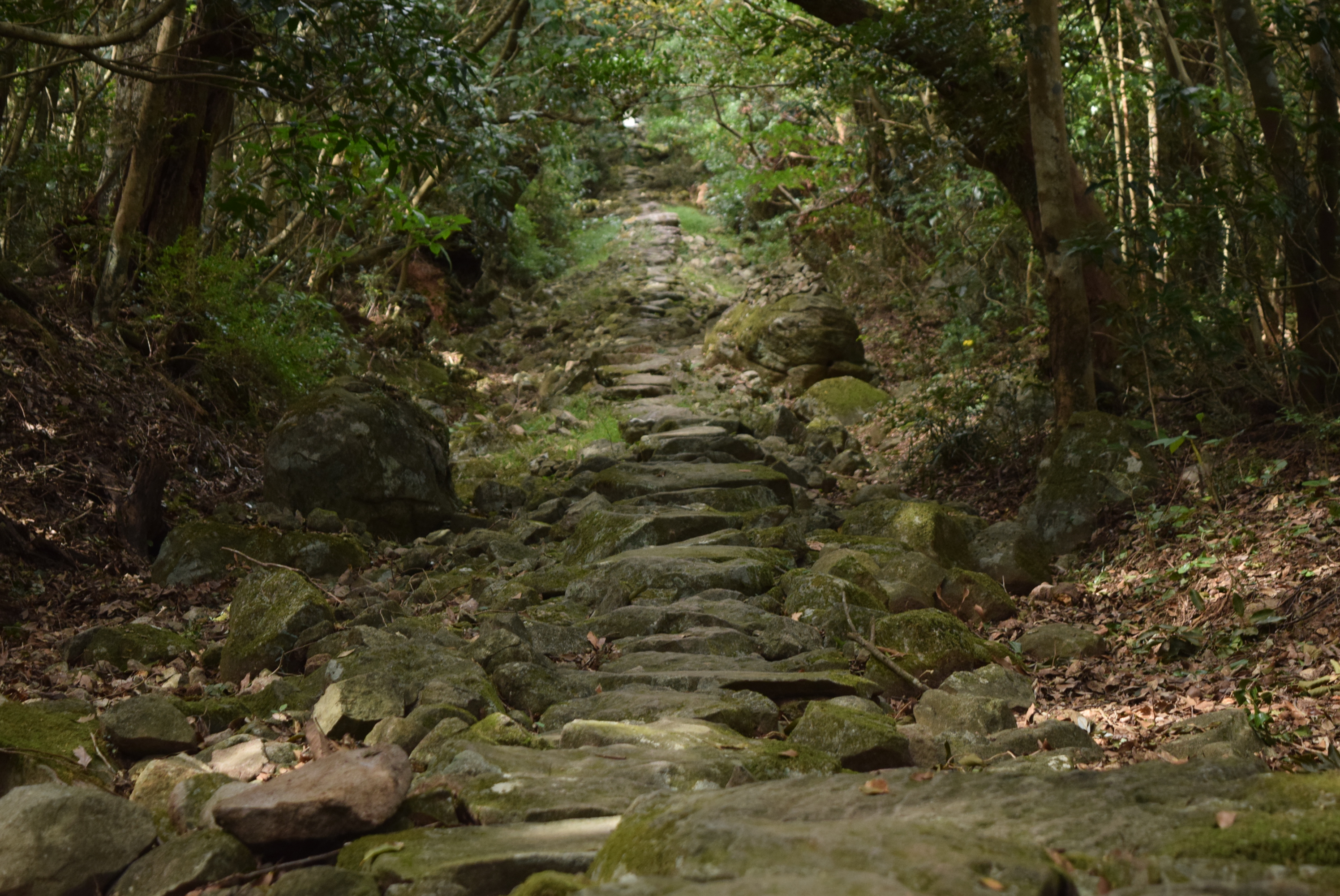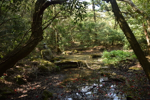 平戸島最高峰の安満岳(536m)は山の上半部に広がるアカガシ主体の原生林と、山頂周辺の輝石安山岩から成る残丘(メサ地形)が特徴です。山頂へ続く石の参道を横に下っていくと楊柳山西禅寺跡があり、明治時代の廃仏毀釈で廃寺となりましたが、現在も残っている庭園に往時の隆盛が偲ばれます。山頂付近にある白山比賣(はくさんひめ)神社の裏手には潜伏キリシタンが祈りを捧げたとされる「安満岳の奥の院様」と呼ばれる石のほこらと薩摩塔があります。