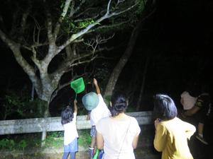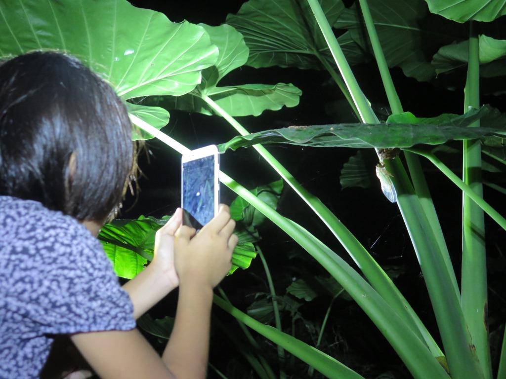 普段、夜に出歩く事はなかなか少ないので、子ども達は少し興奮気味にどんどん先へと進んでいってしまいます。そこでときおり見かける夜の生き物に注意を向けてもらい、昼間との活動の違いや、夜にしか見られない生きものの姿などを観察して貰いました。