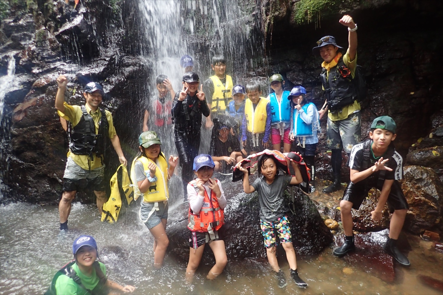 滝の下にてみんなで記念撮影!