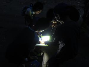 そこで2班に分かれて、見えた生き物や聞こえた生き物の声を記録していき、時間による生き物の移り変わりを実感してもらいます。