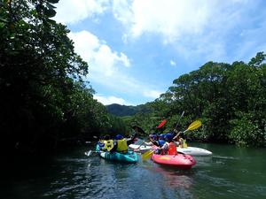 マングローブ林が広がる川を、二人で息を合わせて進んでいきます。