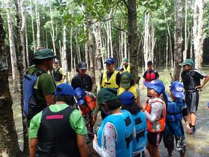 浅くなってきた奥地のマングローブ林でカヌーから降りて、この場所のマングローブ林の特徴や、立ち枯れの原因、それに伴い植樹をしたことなどの説明を受けます。