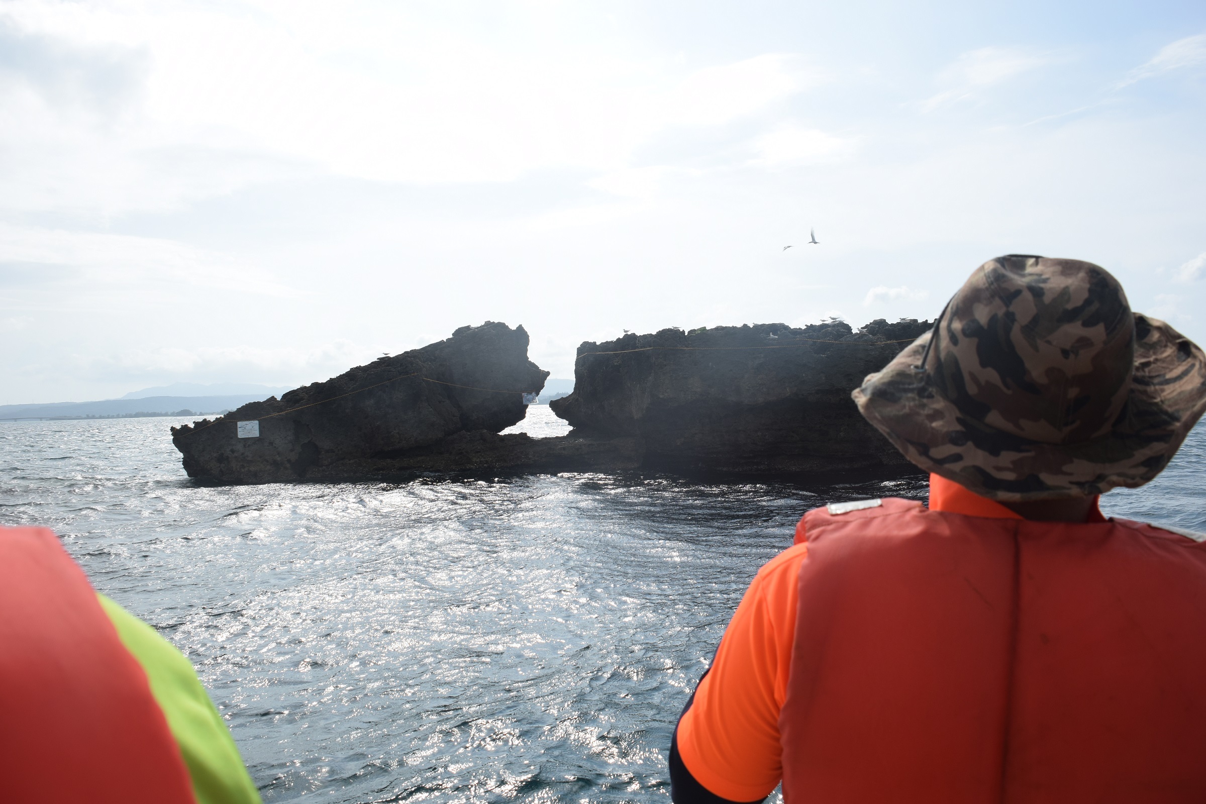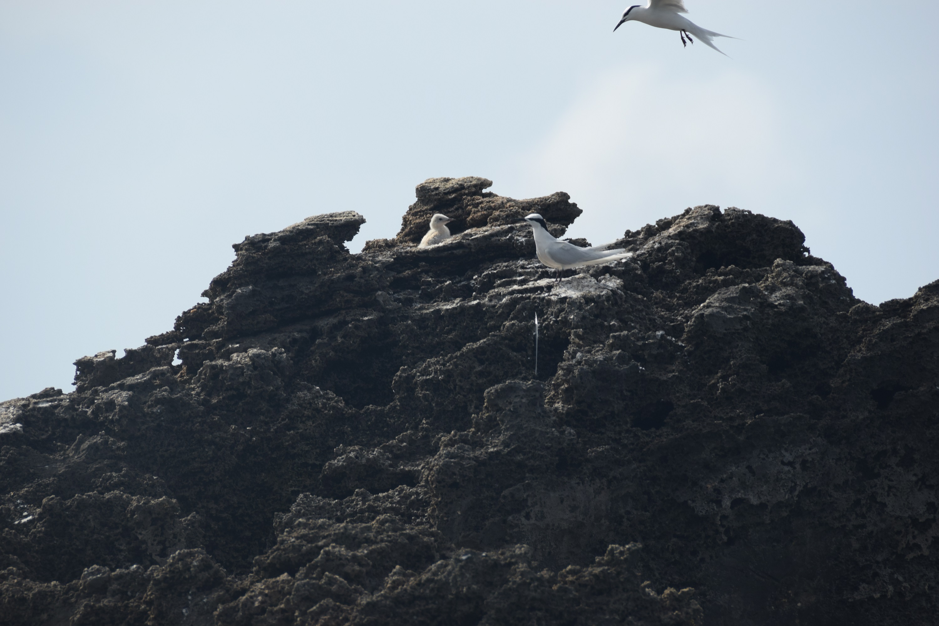 岩礁の上空には小魚を持ったまま旋回するベニアジサシが4羽ほどいました。