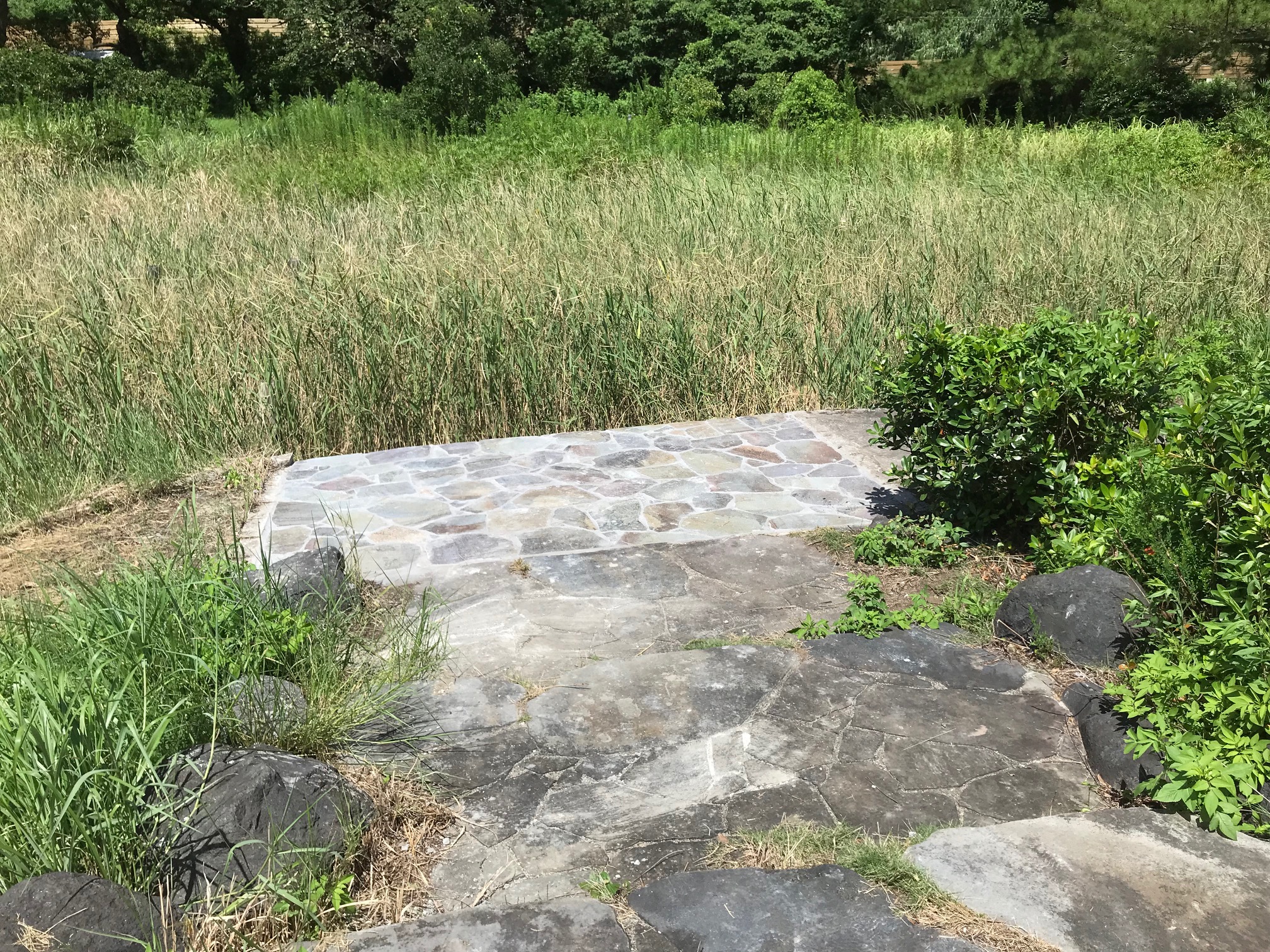 ▲ビオトープ池休憩所横の枕木歩道 ▲石材を使用した補修
