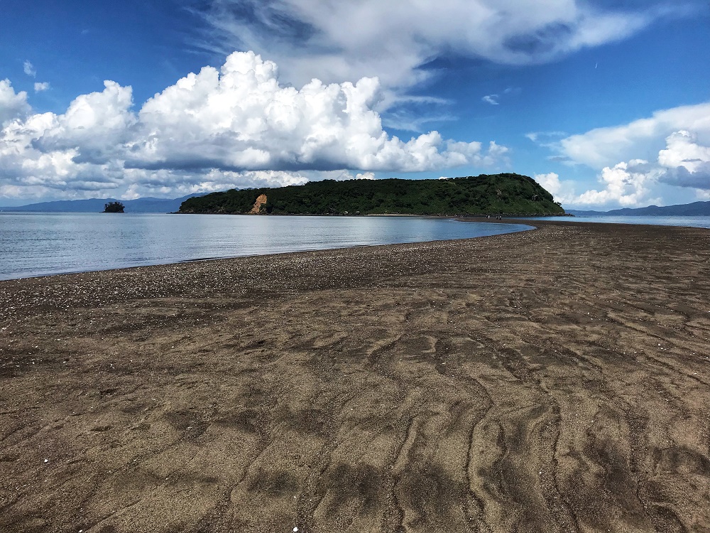 知林ヶ島に渡るため、野営場の奥に進むと砂洲出現予測時刻の通りに砂洲が出現し、砂洲には砂浜に波の跡が残って綺麗でした。