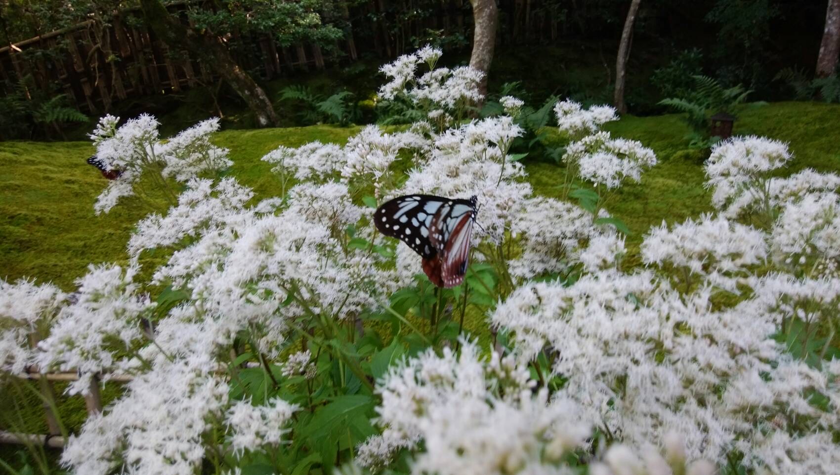 ▲京都、祇王寺のフジバカマに飛来していたアサギマダラ。(10月5日撮影)