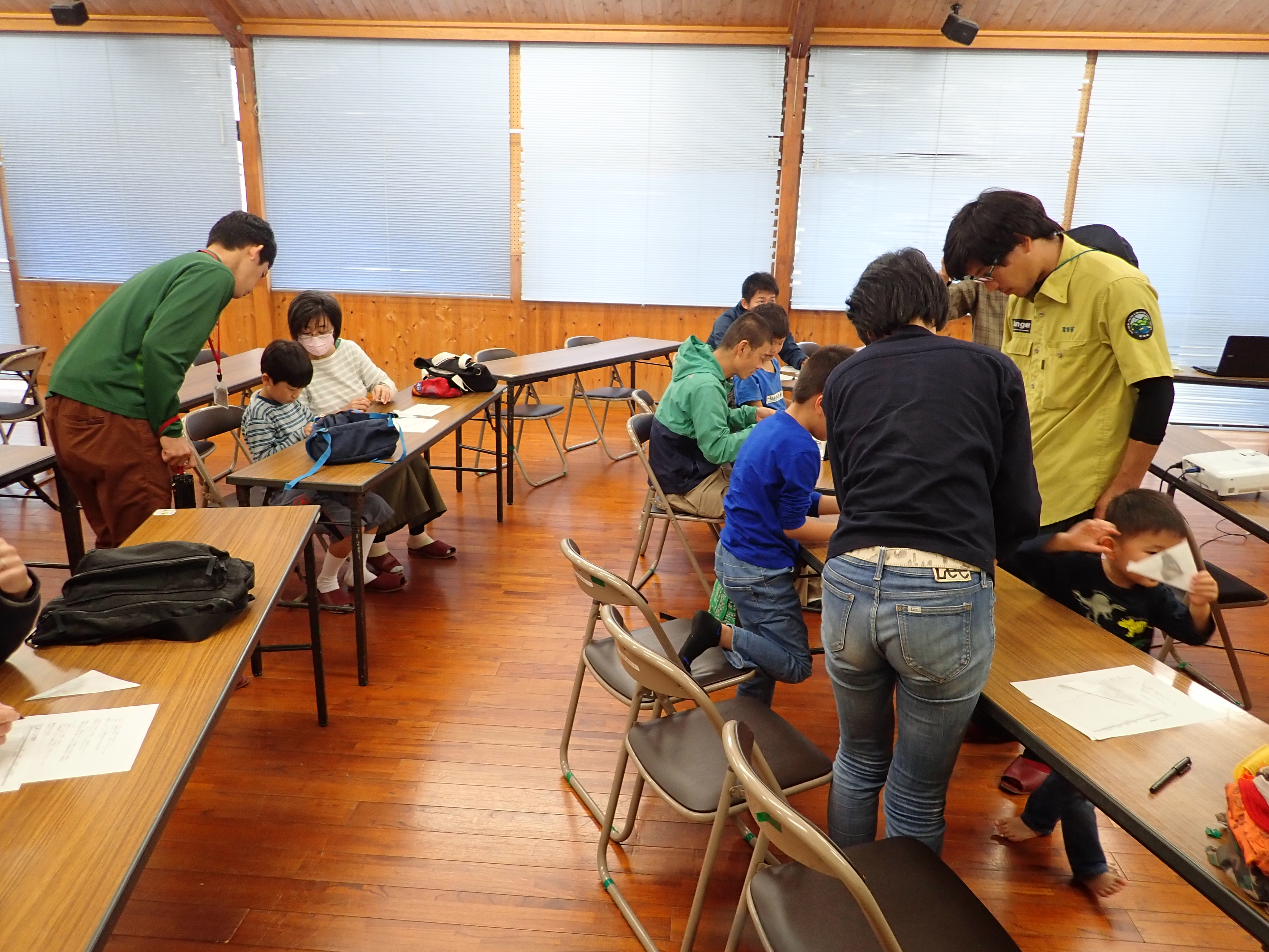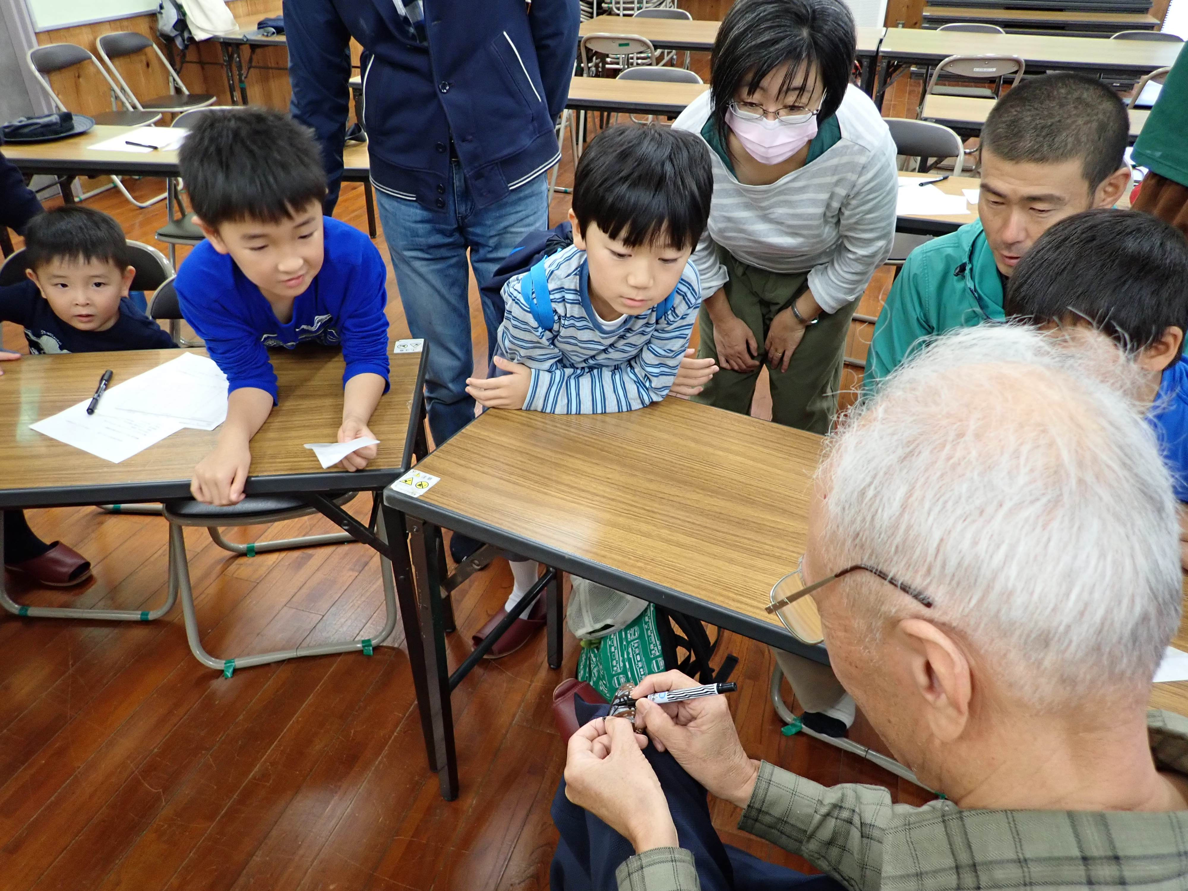 今回のマーキング会は、例年通り最初に室内で久保田氏によるアサギマダラのレクチャーを行い、外に出る前にマーキング練習を行いました。