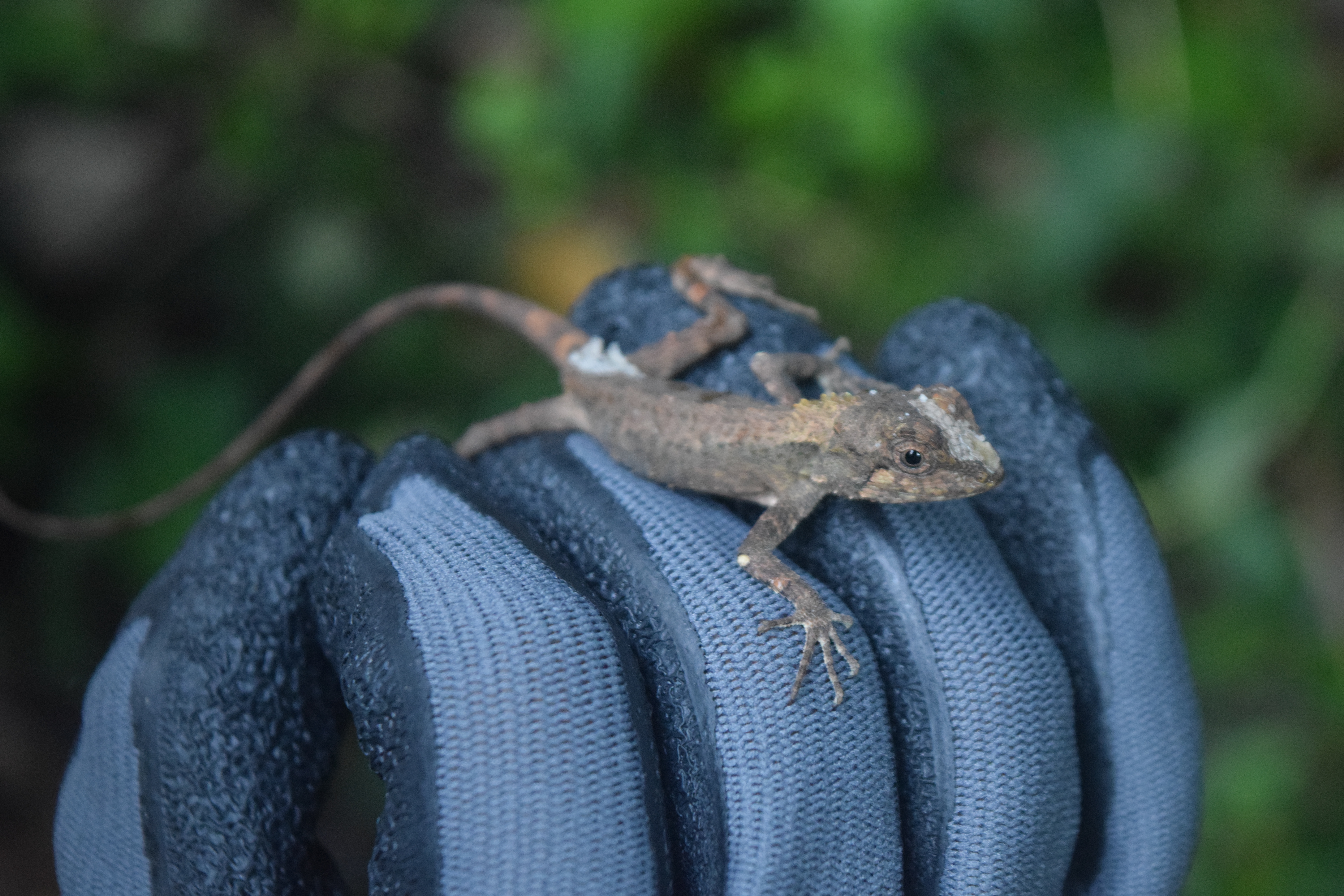 11月12日(火)の調査では、寒くなってトカゲの活動が鈍くなってきたためか、これまで比較的容易に確認できたオスの成体は見つけることができませんでした。しかし、これまでほとんど確認できなかった幼体を4個体も捕獲することができました。頭胴長30mm程度の生まれて間もないような個体だったため、越冬のためにエサ探しを粘っていたのかもしれません。