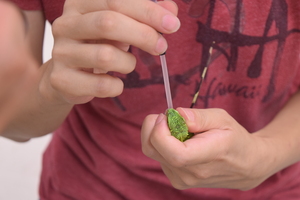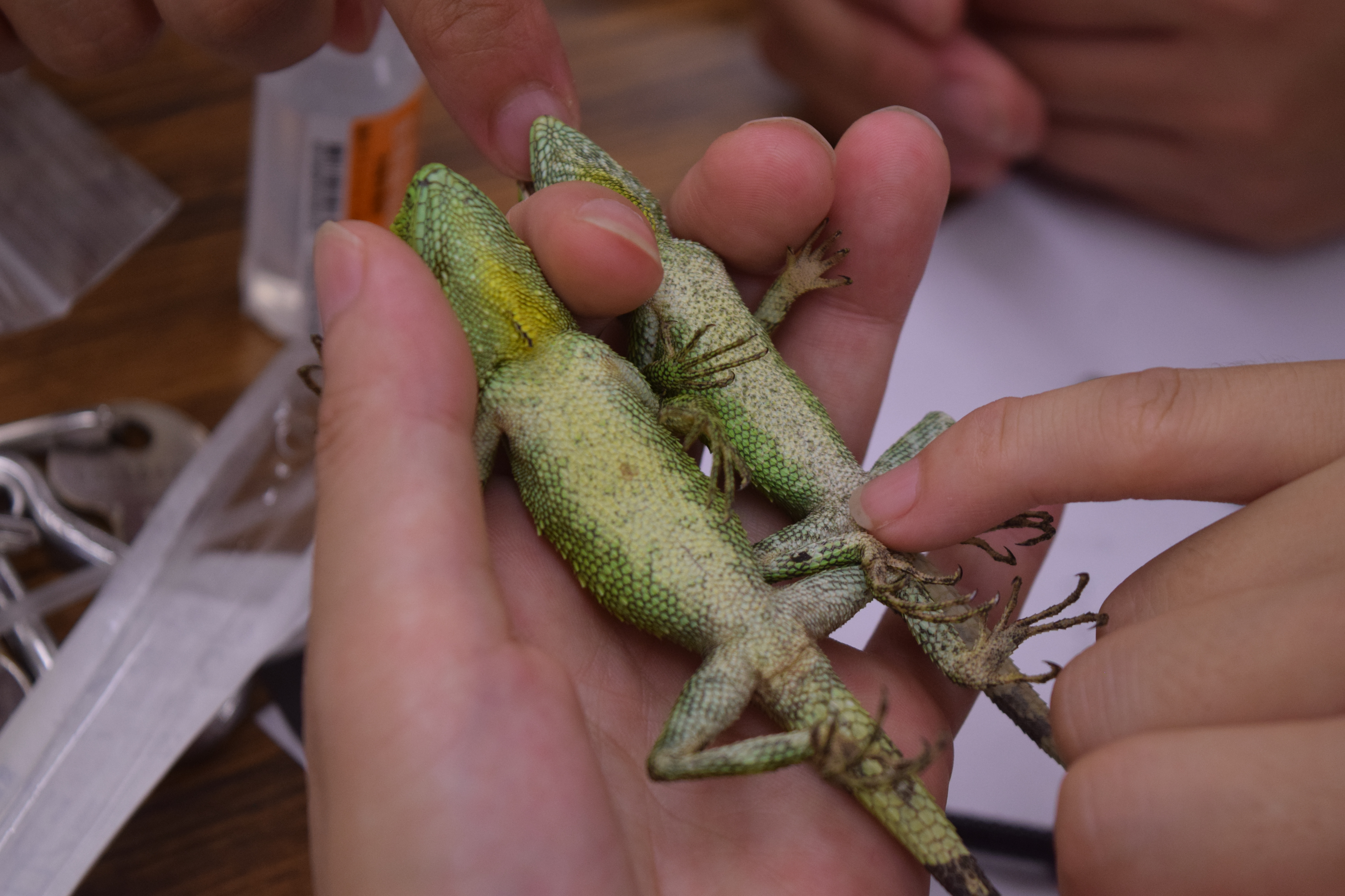 9月9日(月)には朝昼晩計3回調査を行いました。調査にあたっては、釣り竿の先に輪にしたテグスを付けて釣り上げたり、直接手で捕獲したりしました。昼の調査の後、松浦市役所の会議室で、捕獲したトカゲの胃内容物の吐き戻しや形態観察をしました。吐き戻しはトカゲの口へ生理食塩水などを注入し、注入したものと一緒に胃の中のものを吐き出させるという作業ですが、技術が必要な作業であるため、この日はうまくいきませんでした。形態観察では、個体ごとに異なる特徴と共通した特徴を肉眼で観察し、それらが性別や成長段階による差なのか、あるいはただの個体差なのかを考察しました。こちらも併せて専門家に確認を取ってみようと考えています。