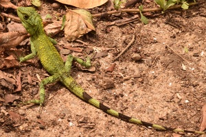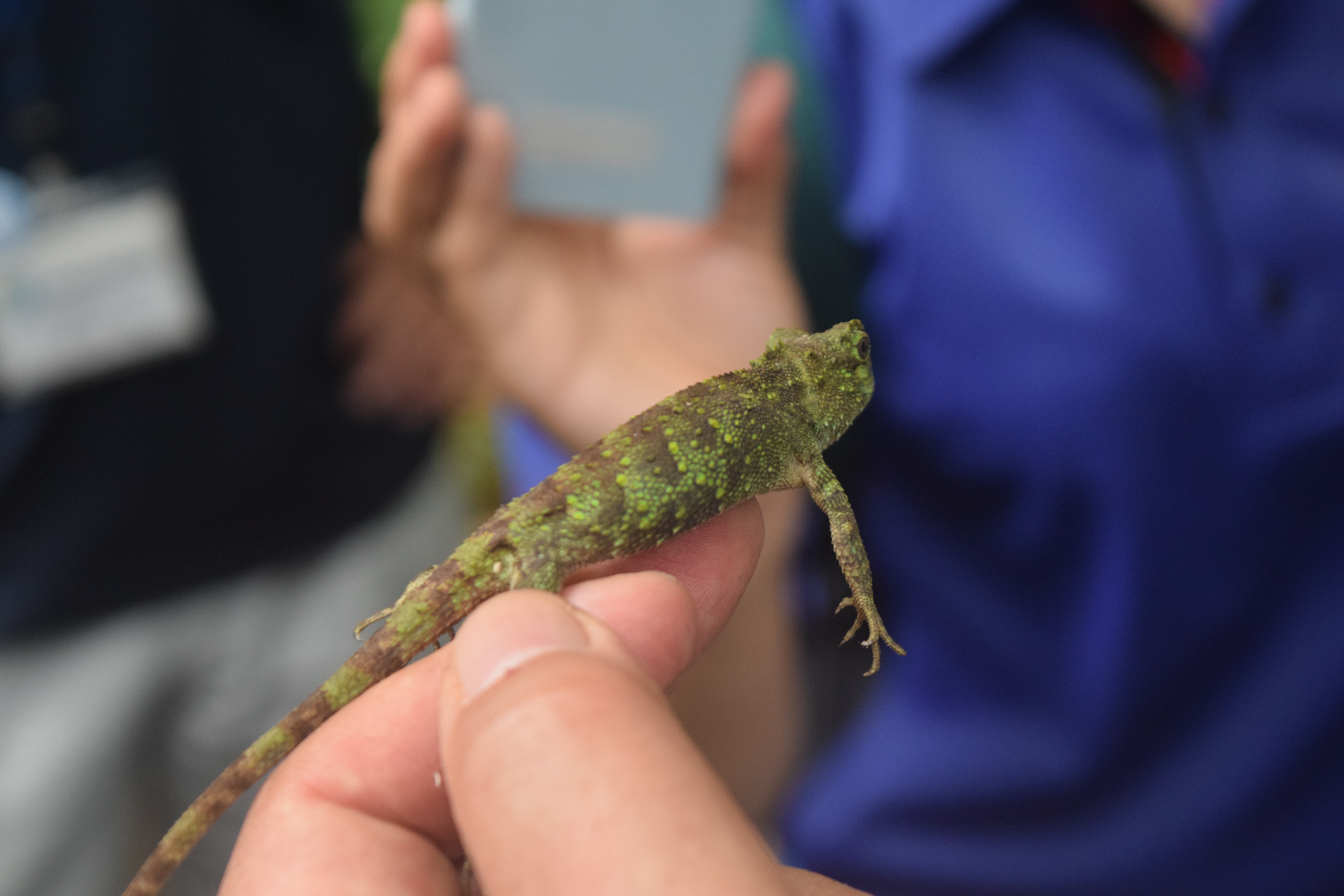 オキナワキノボリトカゲは全長200~300mm、頭胴長(頭の先から尾の根元までの長さ)60~85mm程度の、尾長が長い樹上性のトカゲで、食性は昆虫などの小動物です。少なくとも原産地では冬眠はしないようです。オスの成体は日中、木の枝上の見通しのよい場所から縄張りを見張っており、幼体やメスの成体は木の根元付近の低い場所にいるとのことです。また、オスの成体は鮮やかな黄緑色をしているため、地味な茶色の幼体やメスの成体と比べ簡単に見つけることができます。ただ、周囲の明るさに合わせて多少は体色の明暗を変えることができるので黄緑色と茶色の混じった成体も多く、現状、私たちでは雌雄の判別が難しいため、専門家に判別の基準を確認しているところです。