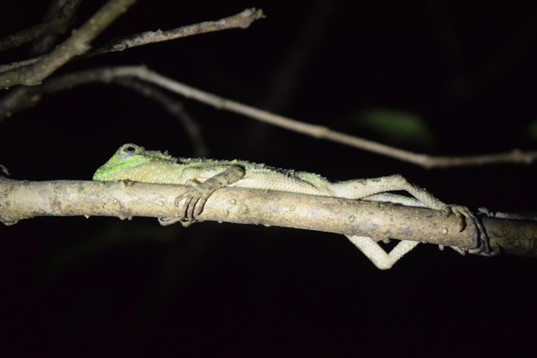 夜の調査では懐中電灯で枝先を照らすと寝ているオキナワキノボリトカゲが5個体確認できました。一見、起きているように見えても光に反応せず、顔の前で私が手を動かしてもピクリとも動きませんでした。