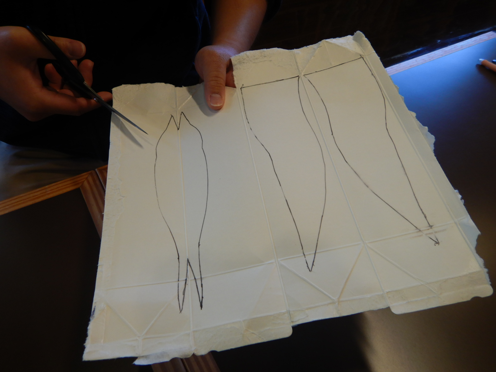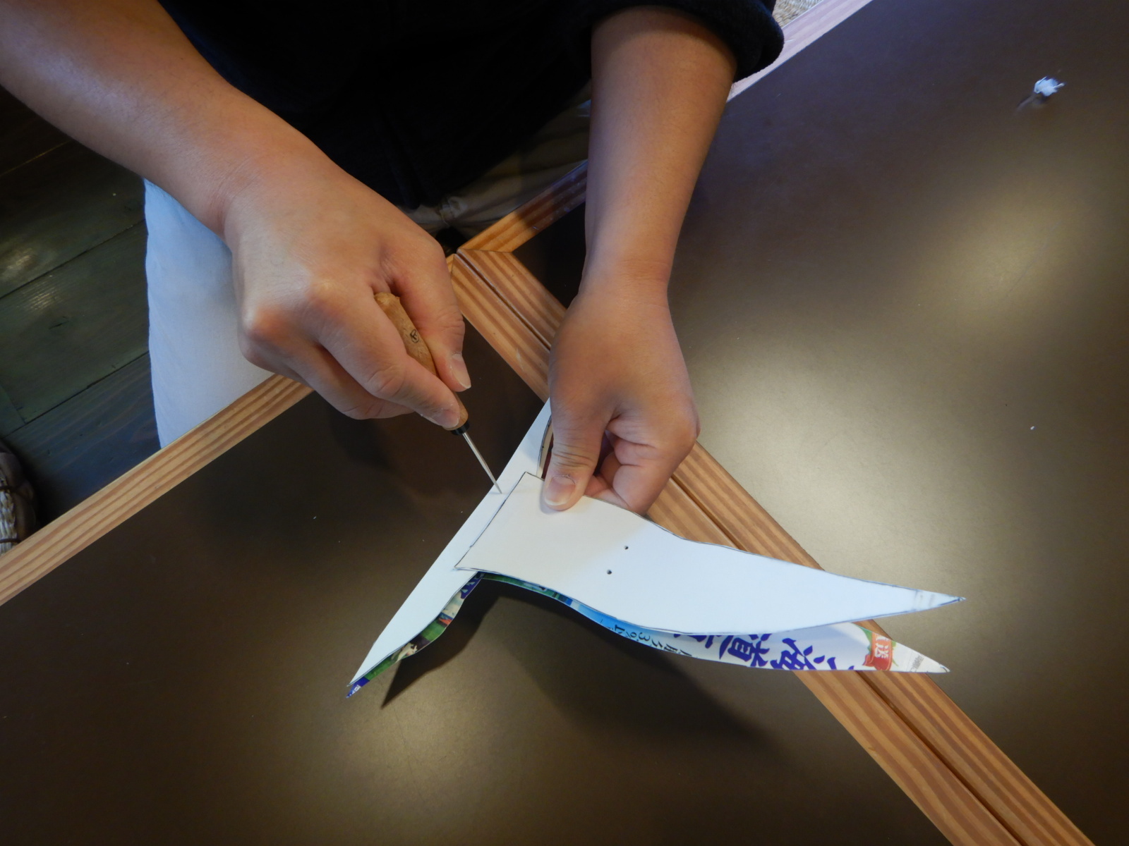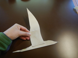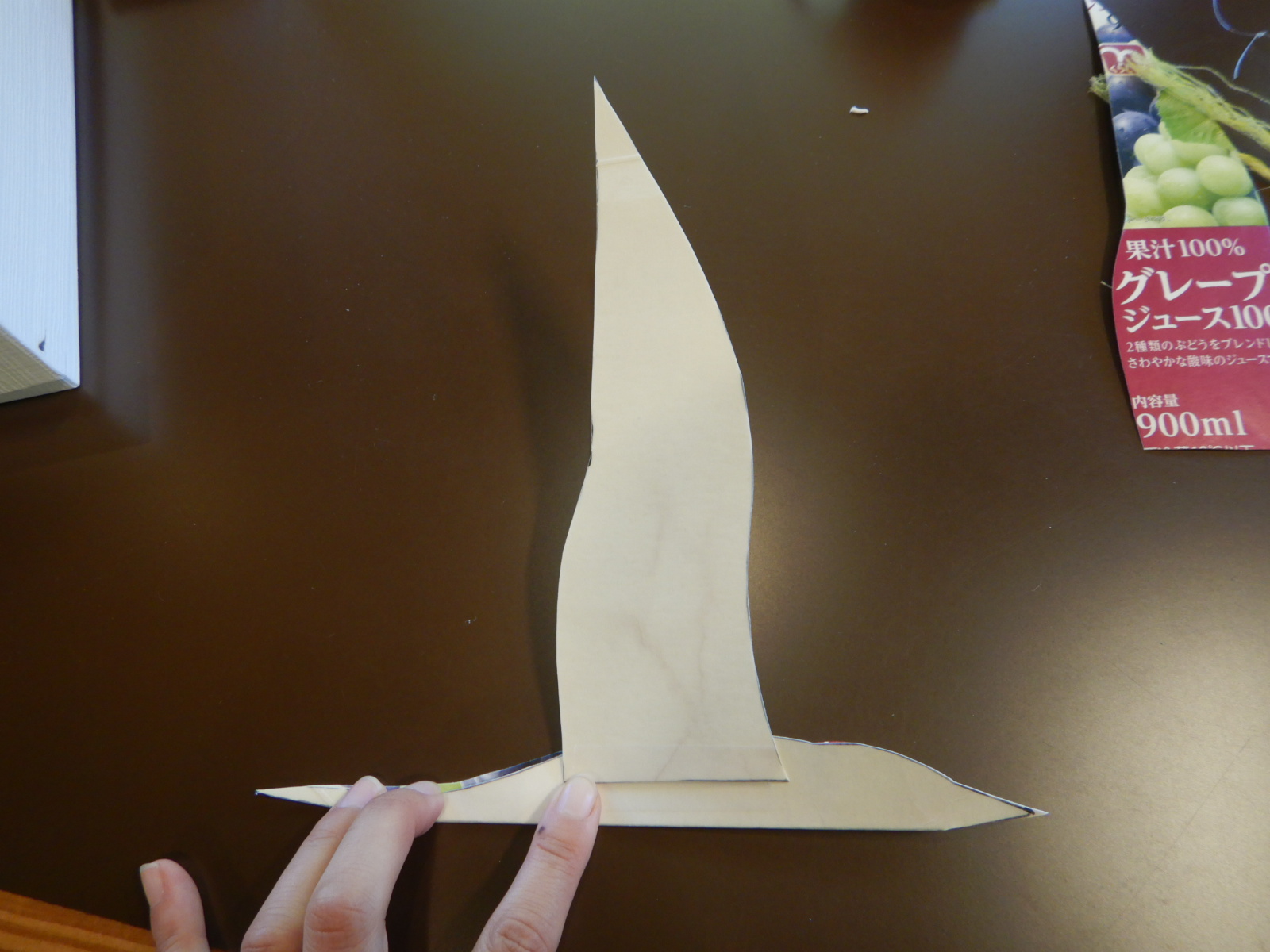 図を参考に、紙パックにアジサシの胴体と翼の形を書いて切り取っていきます。