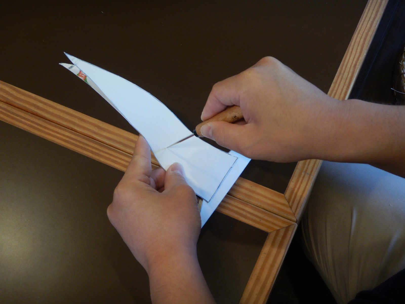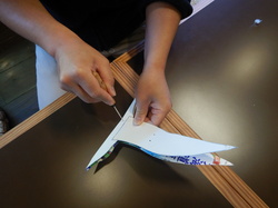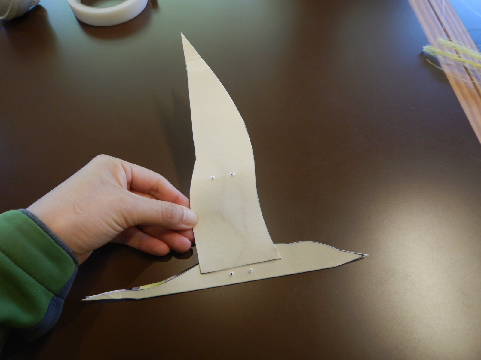 次に胴体の白が表になるように山折りにして、翼を打ち下ろした形に当て、テープでとめます。