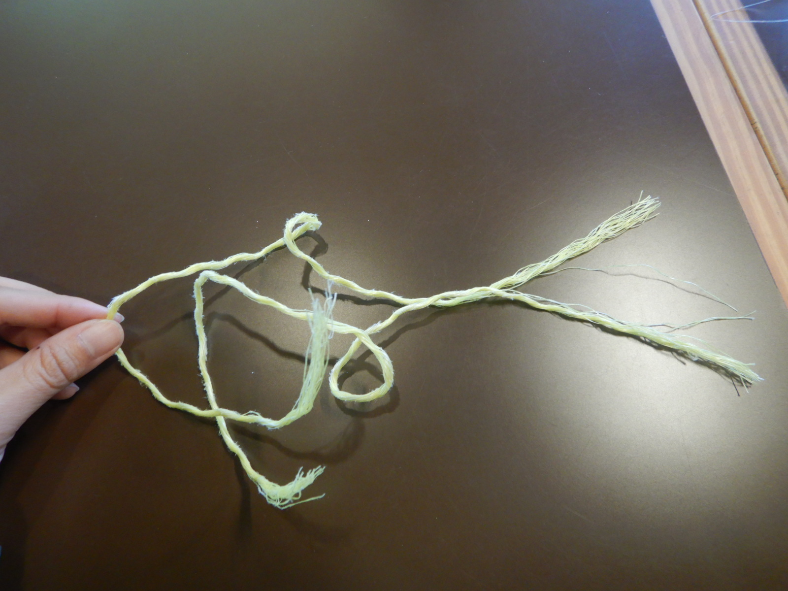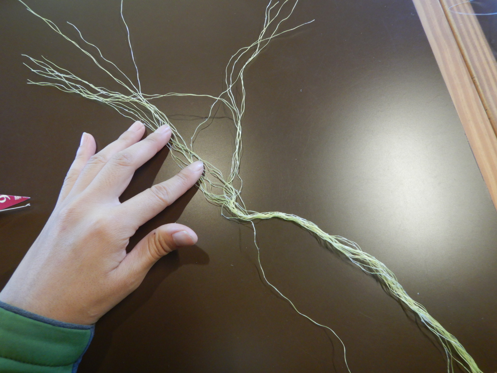 漁網を使う場合は、繊維をほぐして使います。3本用意して下さいね。