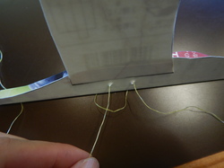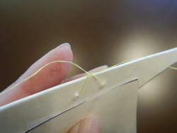 1本目の糸を翼の上から下、下から上へと通してなるべく糸の端っこで固結びします。