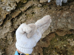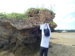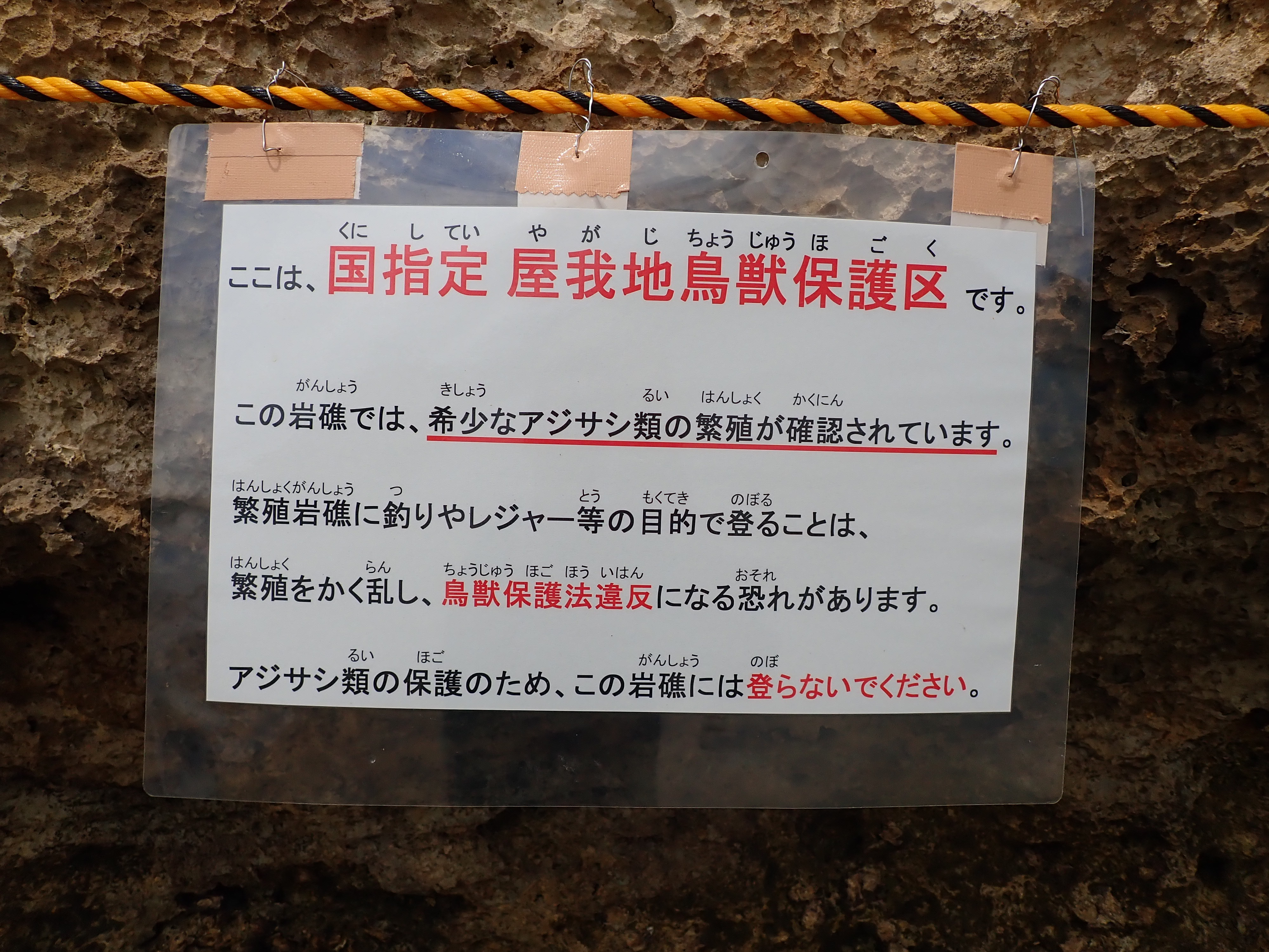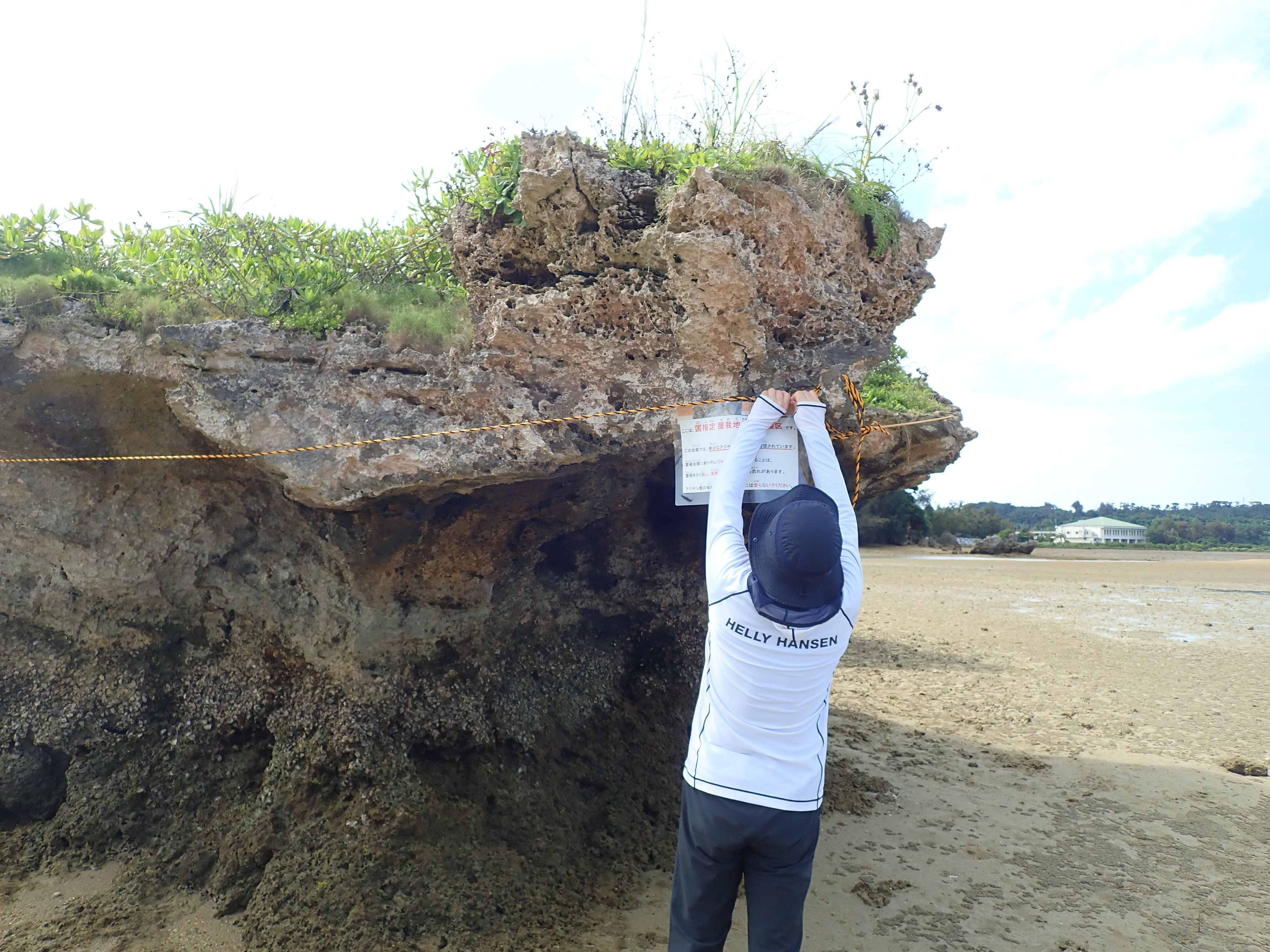 岩礁上の確認をしたら、ロープと看板を設置します。