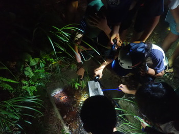 夜の生き物の鳴き声に耳を傾け、寝ているところを起こさないように注意しながらライトを照らして生き物を見つけます。