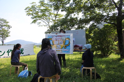 ▲VC横の広場を使って青空教室。自己紹介、活動の目的について話し合いました。