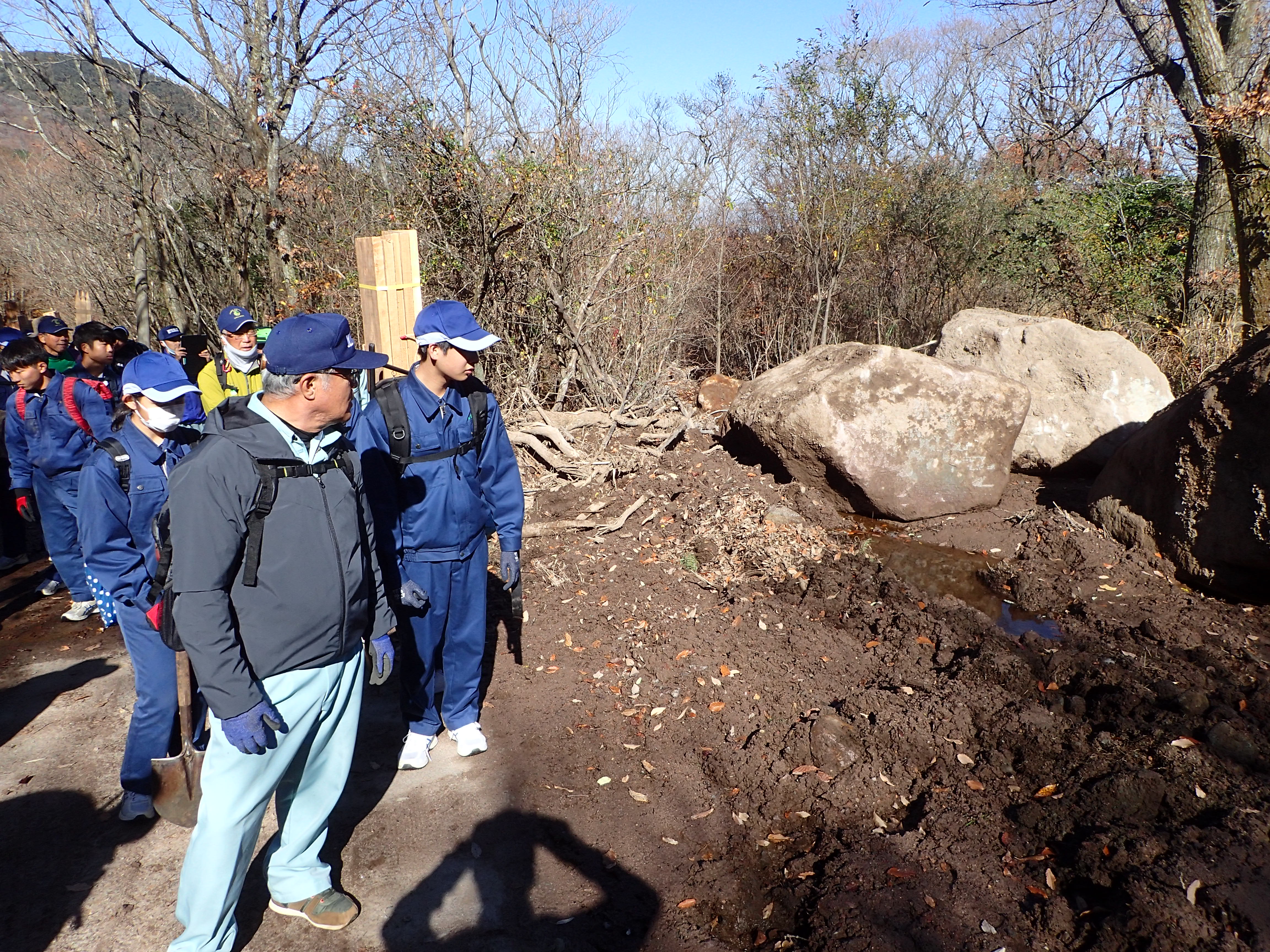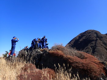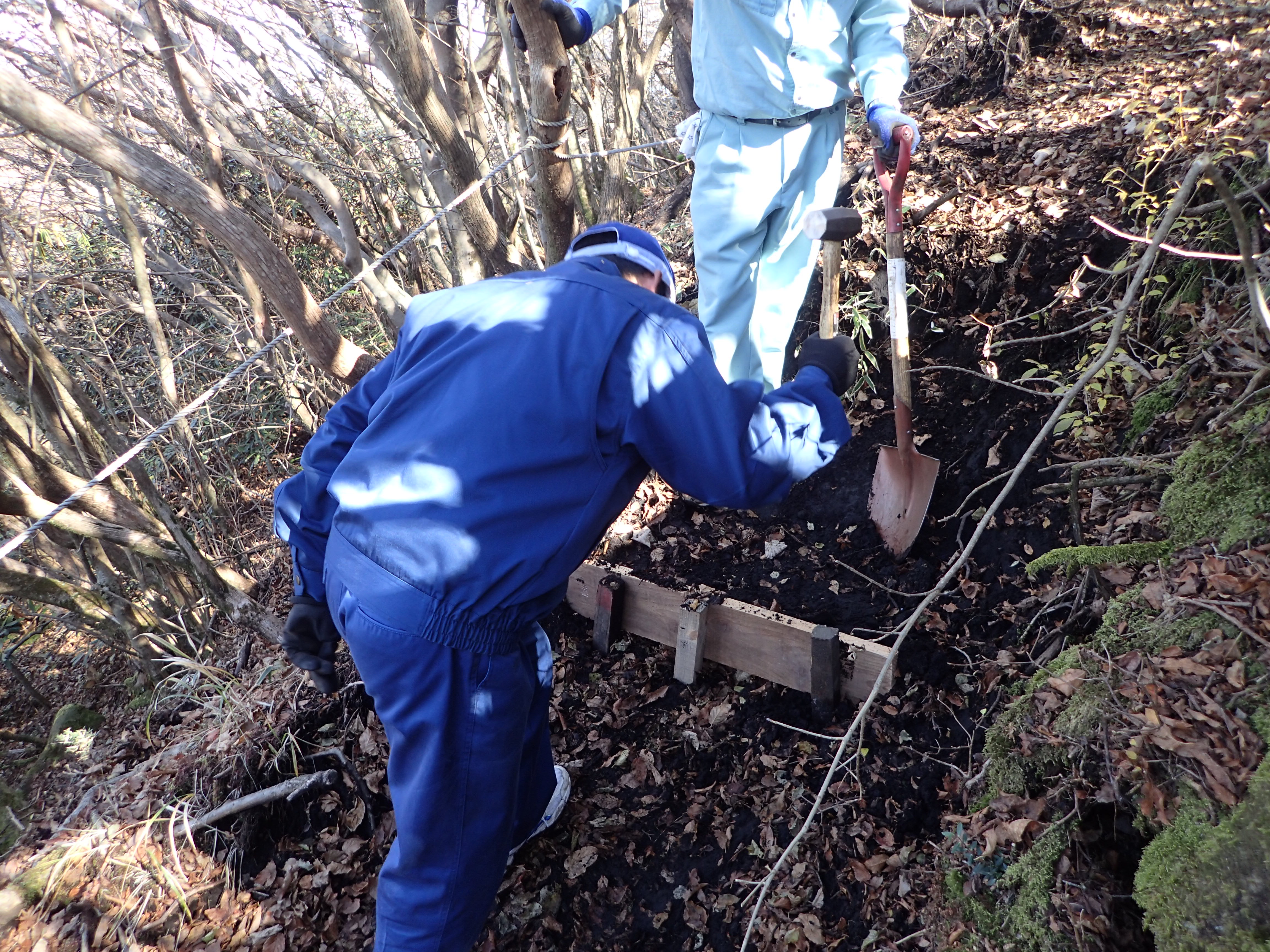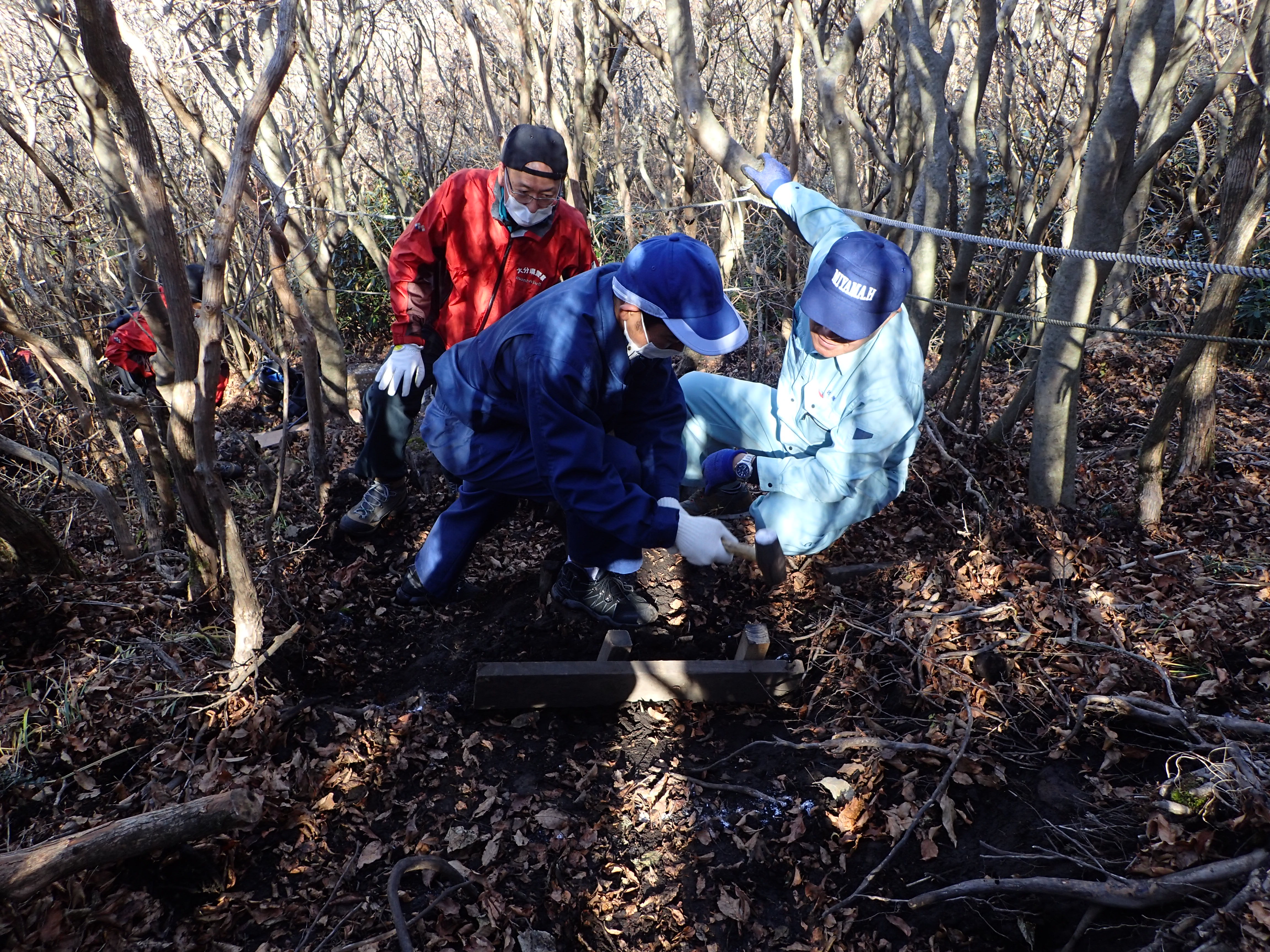 11月9日に、大分県立玖珠美山高等学校3年生の卒業記念作業として、登山道の整備を行いました。玖珠美山高校3年生を主体に、環境省、大分県、九重町、大分県山岳遭難対策協議会、くじゅう地区管理運営協議会、九重の自然を守る会、くじゅうネイチャーガイドクラブ、大分森林管理署のグリ-ンサポートスタッフのサポートのもと、指山登山道の整備を行いました。5班に分かれ、班のリーダー指導のもとで、土留めによる浸食の防止、木階段の設置、劣化したロープの張り替え等を行いました。
