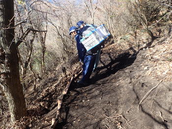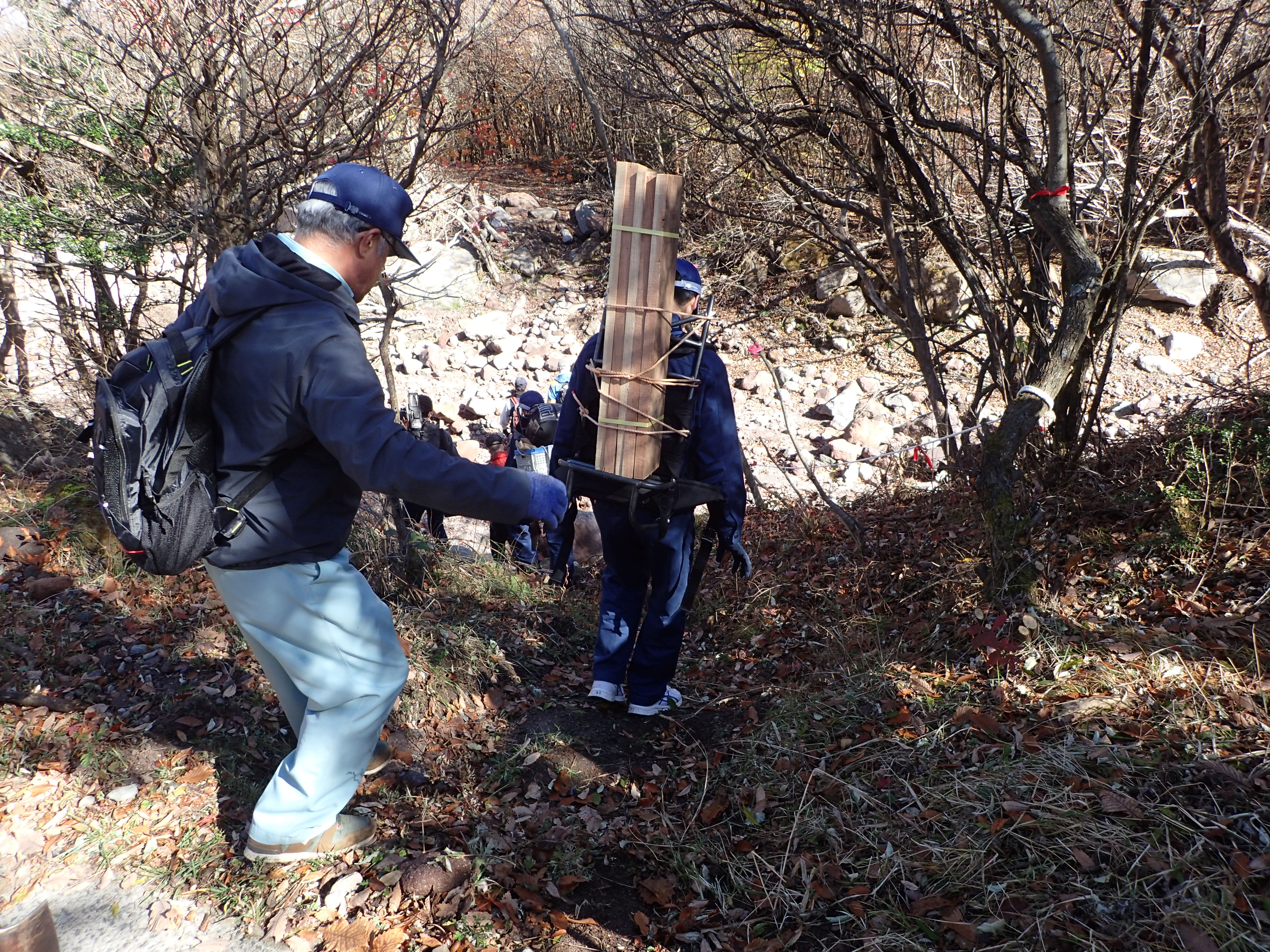 ▲背負子を使って生徒達が資材の運搬を行います