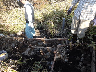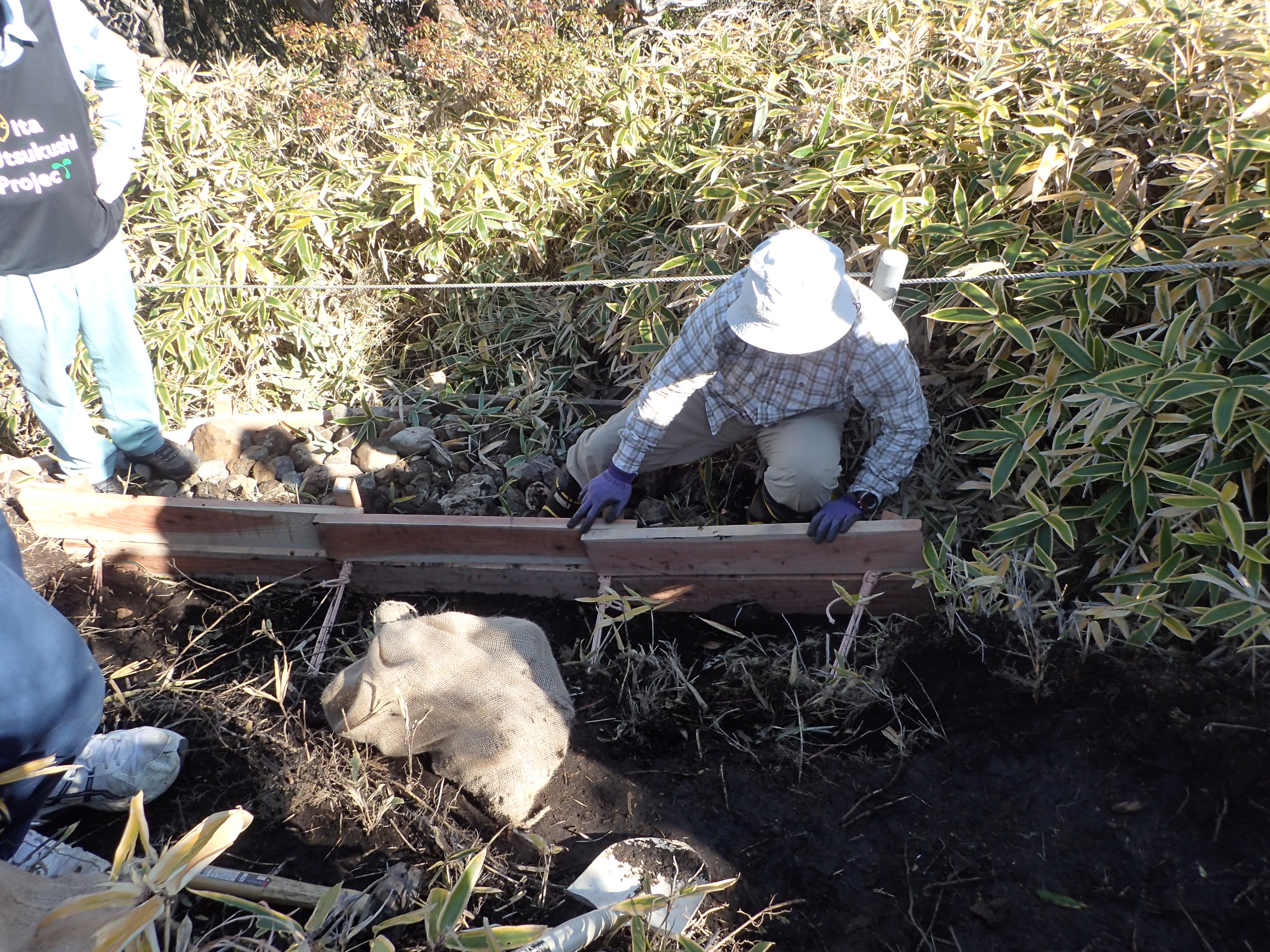 ▲石が現場になく、試行的に木の枝を敷いていきます