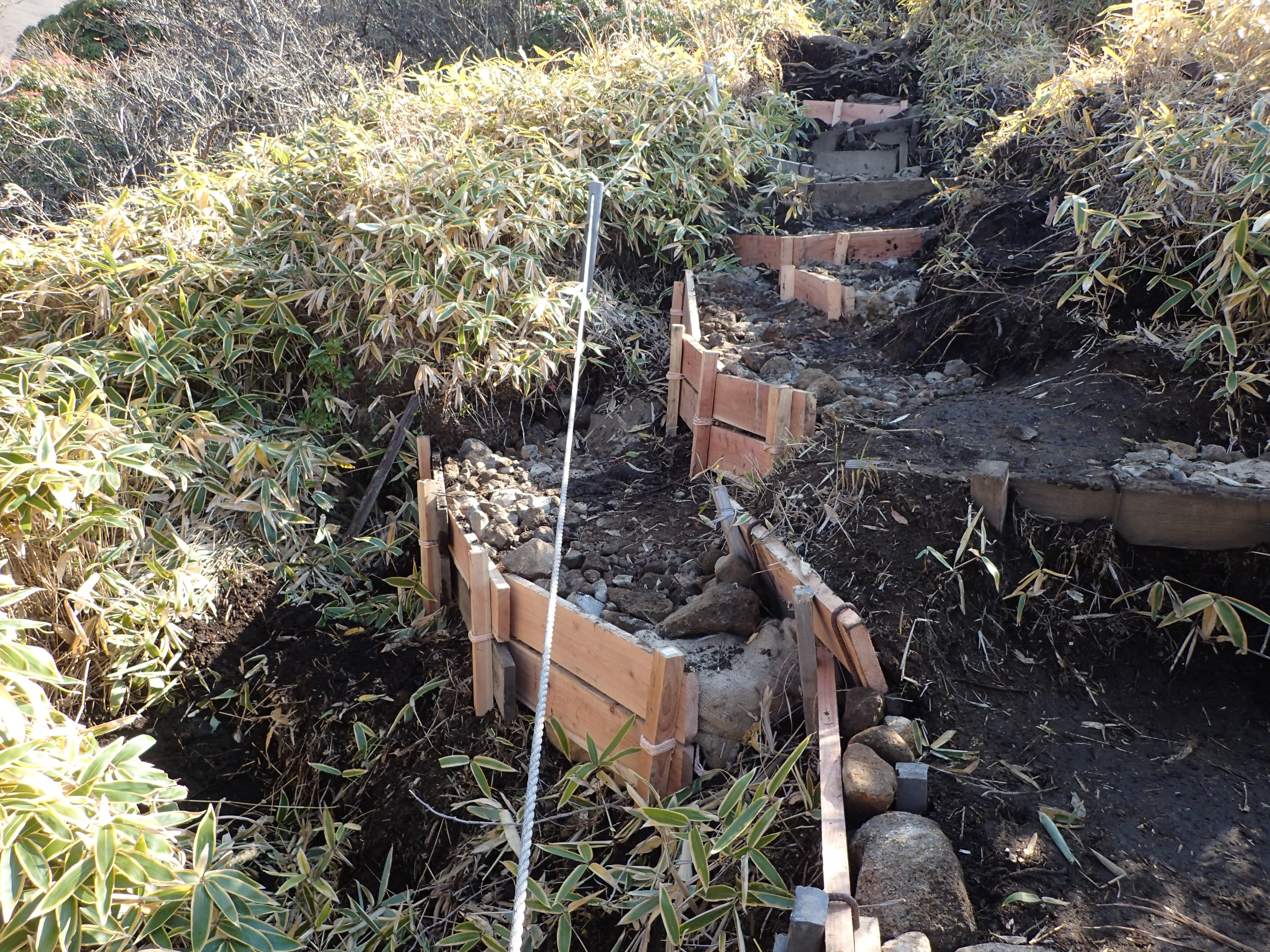 水の通り道になり、登山道側面から崩れていた箇所ですが、4点結束タイプの土留めを2段整備することで崩落を防ぎました。