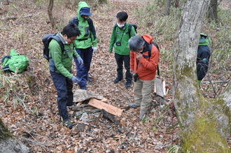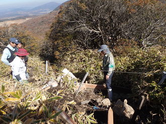 実際に登山道の整備箇所を見た後に、長者原園地にて、解説を行いながら1段制作しました。