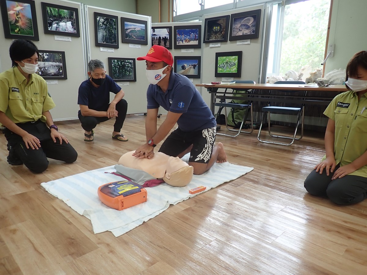 今回は、新型コロナウイルス感染防止のため、室内マスク着用、少人数開催などの対策を徹底して実施しました。一般社団法人沖縄ライフセービング協会八重山担当理事の小山豊さんを講師に迎え、室内講義と海洋実習に分け、安全に観察会を行うため、特に重要な安全管理の知識・技術の向上を目的とした講習会を行いました。