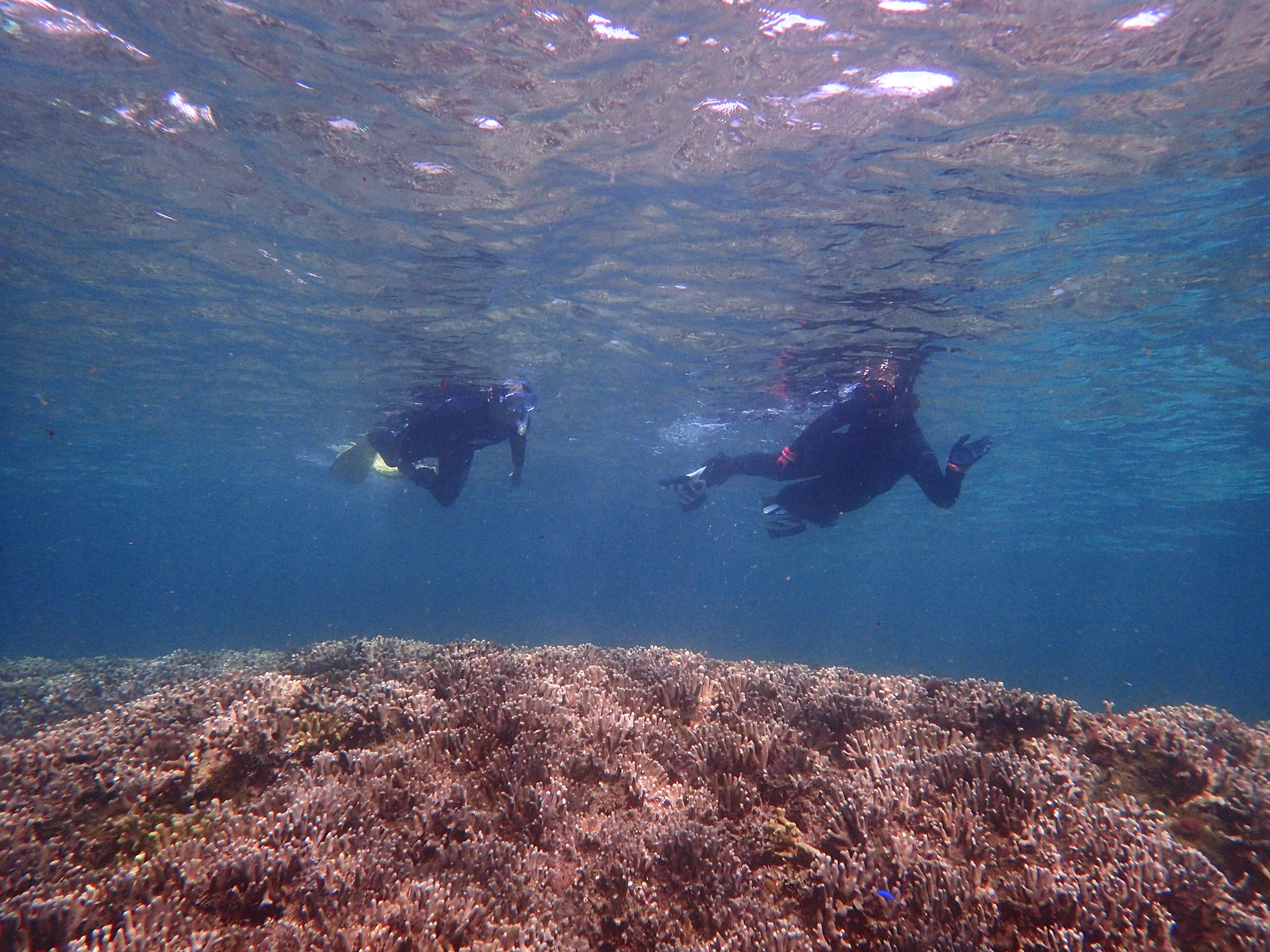 海洋実習は、実際にいつも「海の自然教室」で観察している場所で行いました。まずは観察ルートの危険個所を確認しながら2人1組のバディになって泳ぎます。