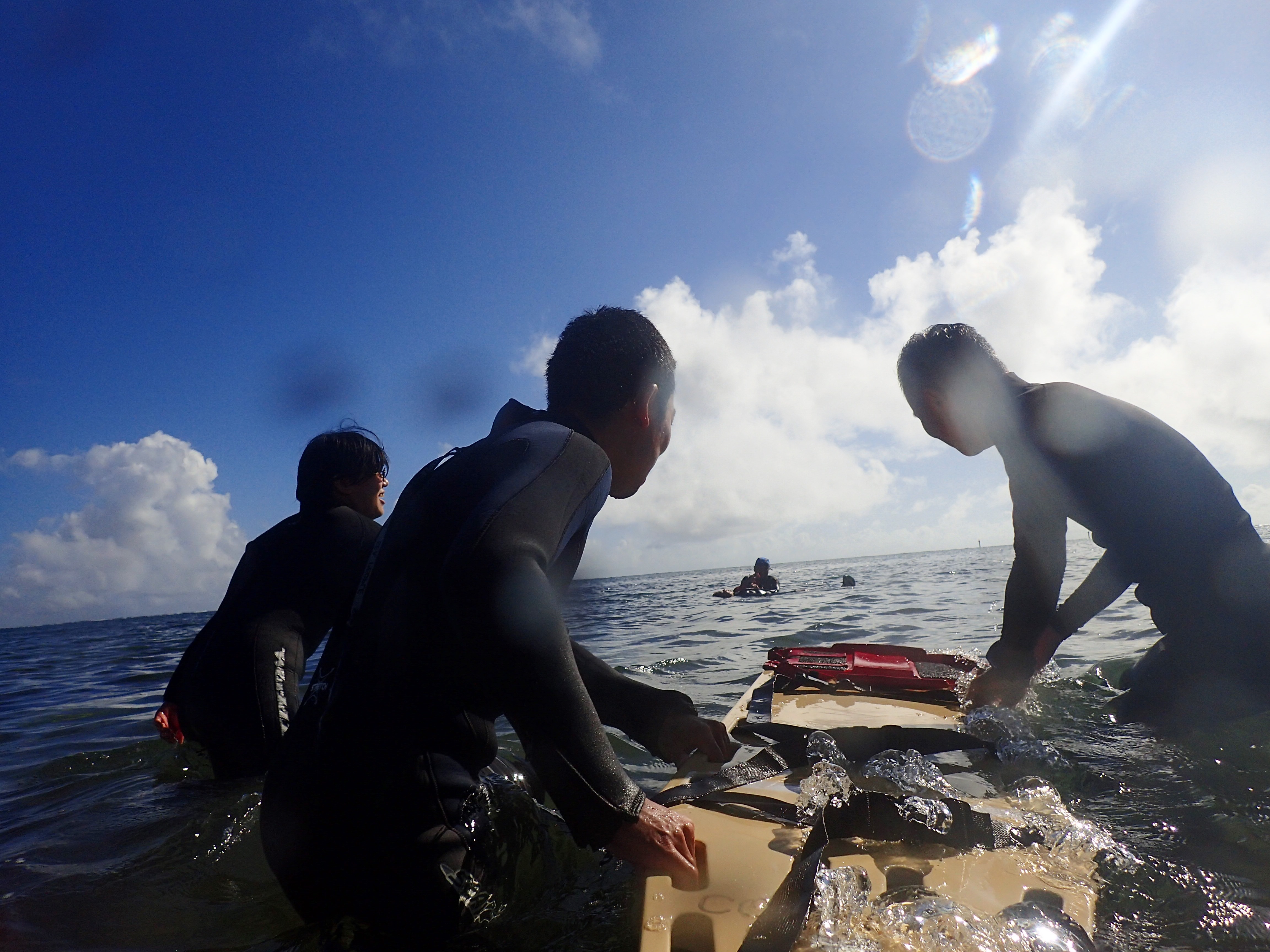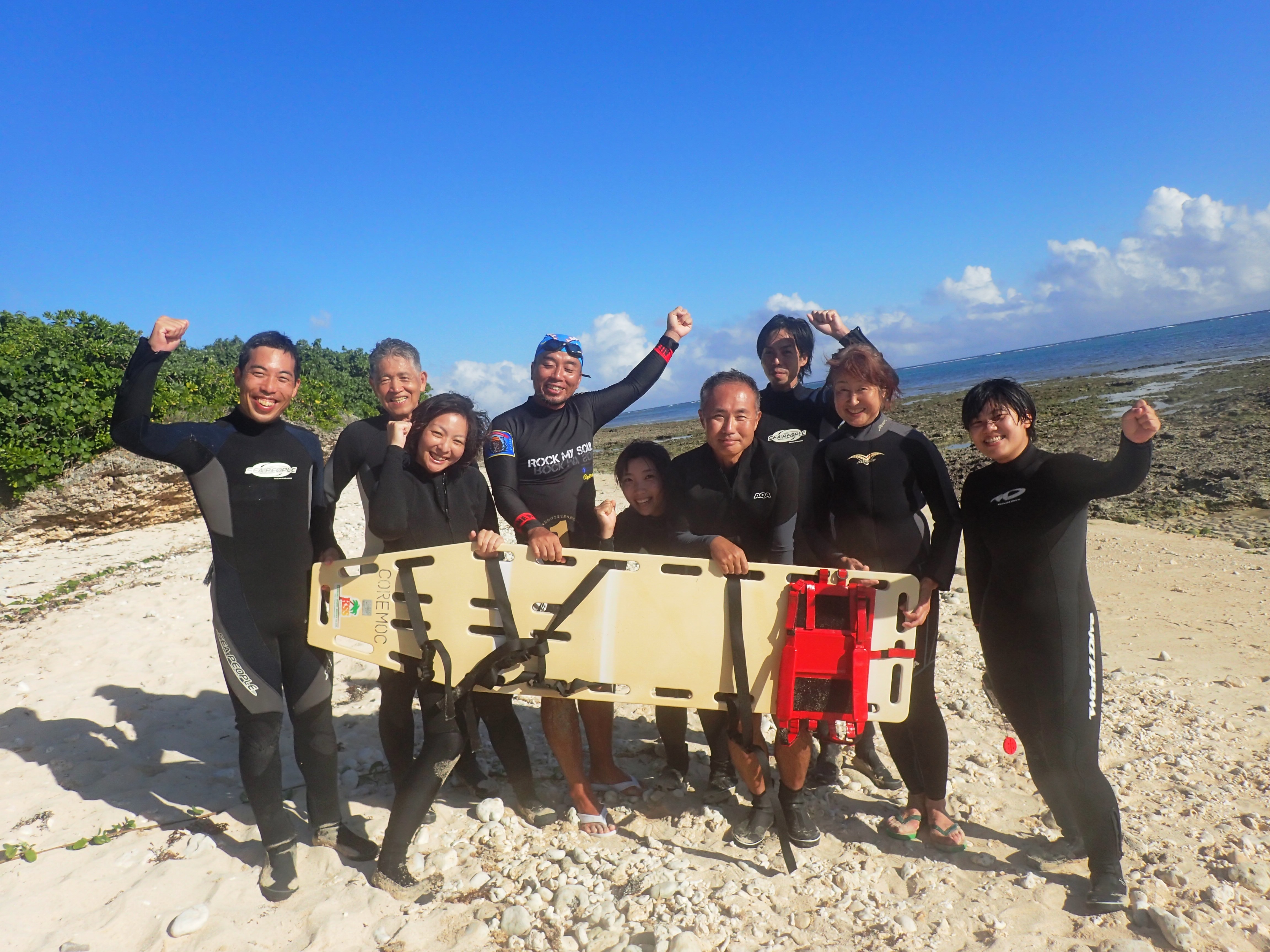 室内講習でのCPR実技から、海洋講習でのバックボードを使った運搬方法まで、内容の濃い講習会となりました。