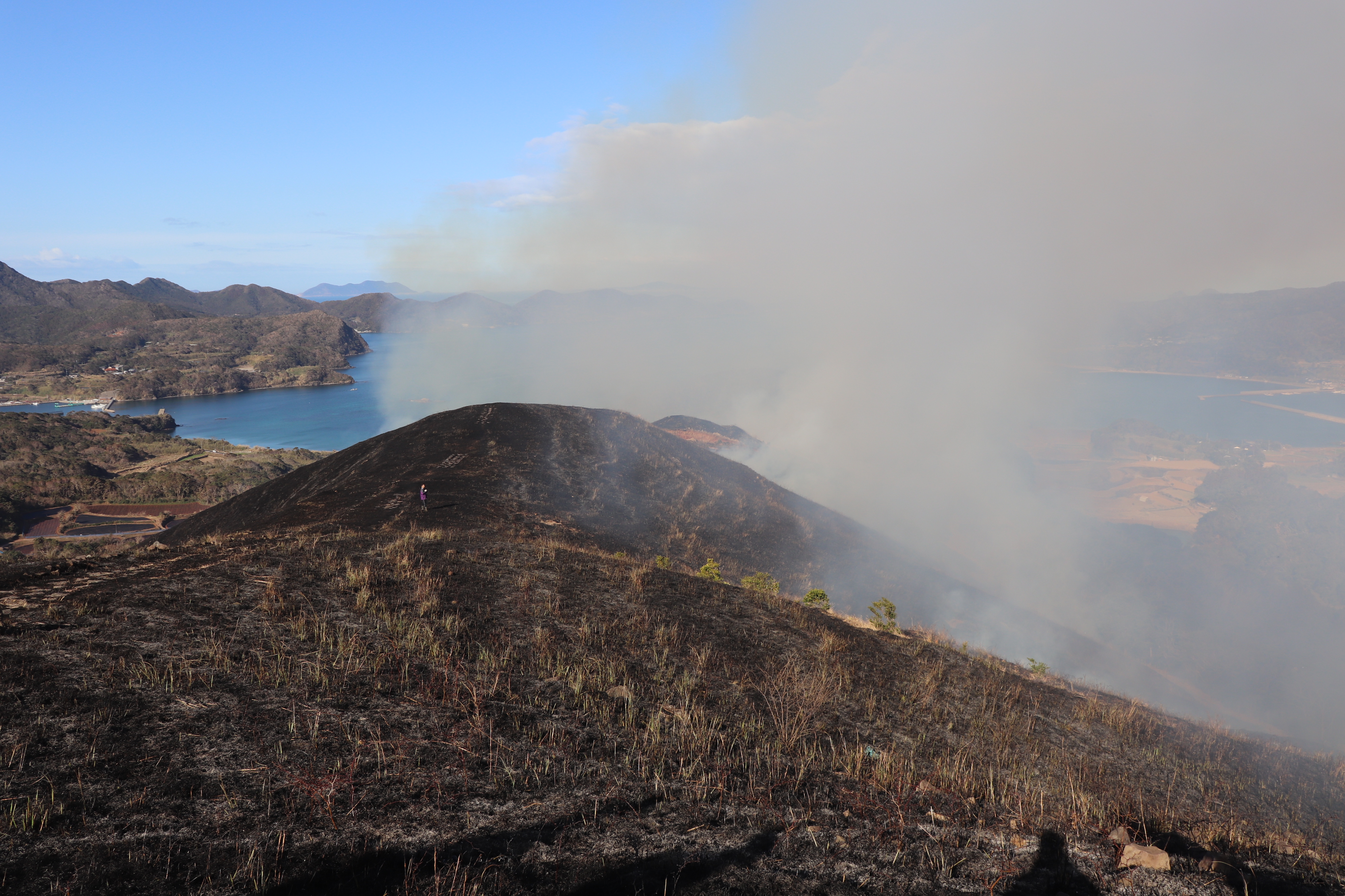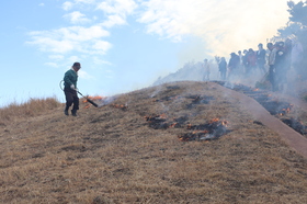平戸島の南にある上段の野では、毎年2月に地元の方々により野焼き作業が行われています。今年は2月14日(日)にパークボランティアの皆さんとお手伝いを行ってきました。
