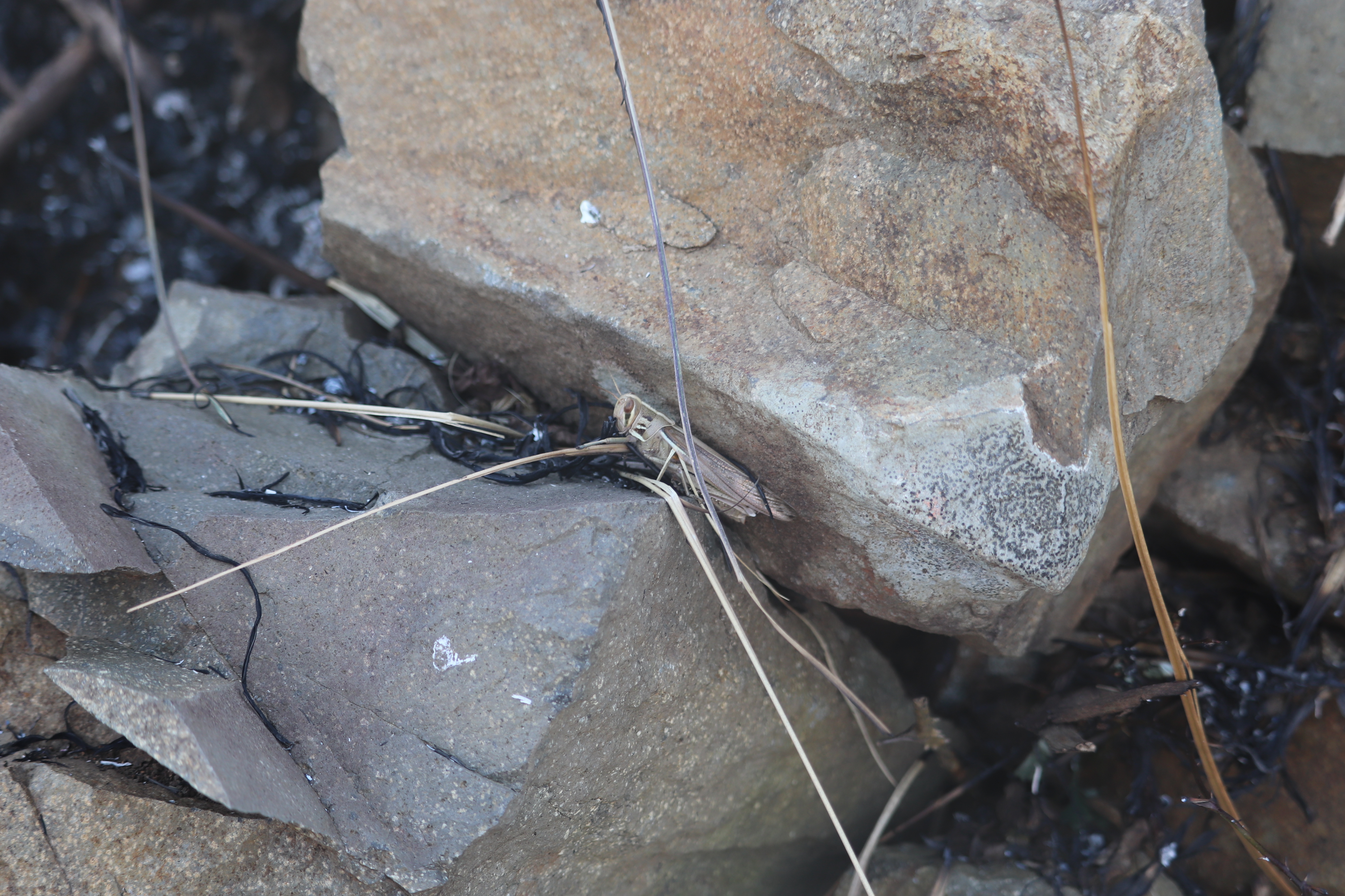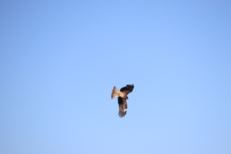 急降下しようとするトビ 避難したバッタ