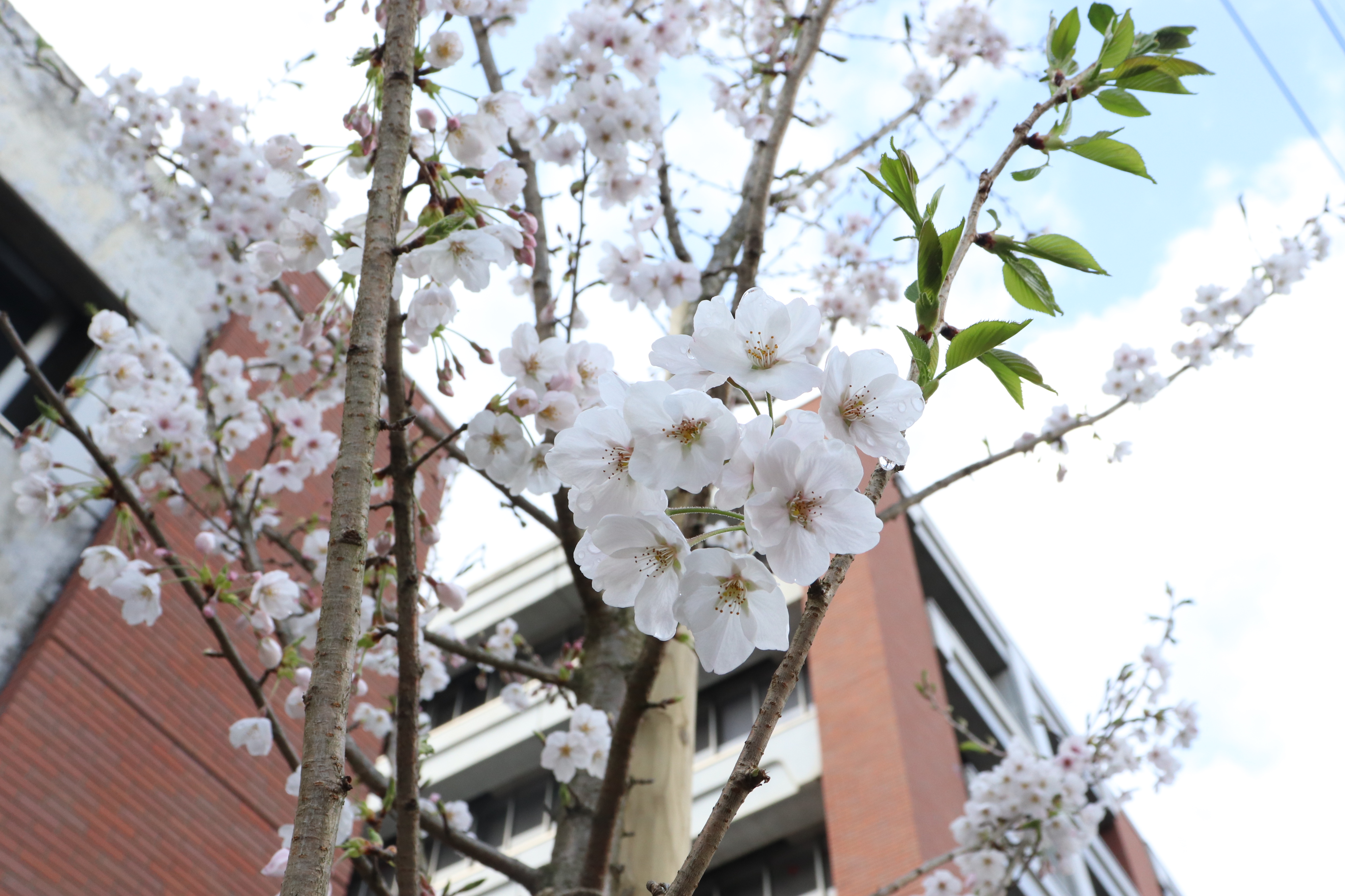 事務所のある合同庁舎に新しく植えられたソメイヨシノの花が開花しています。