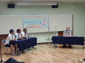 サンゴに詳しい琉球大学名誉教授の土屋先生が、サンゴ・サポーターである石垣島の大人気アーティスト「きいやま商店」からの質問に答える形式で、写真で説明しながらサンゴの基本的なことについておさらいしました。